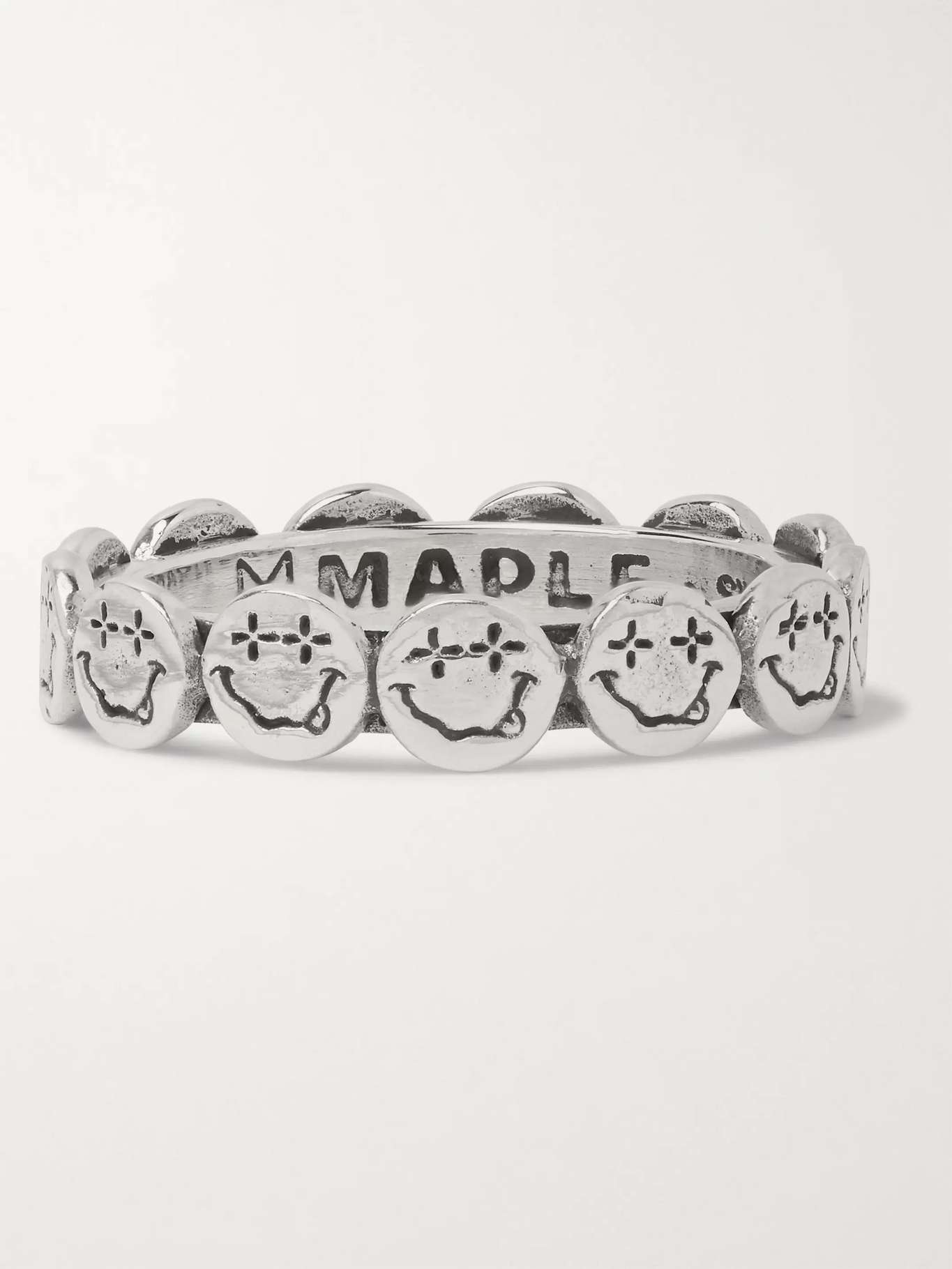 Self-taught designer Mr Austin McMahon says MAPLE is driven by a mix of subcultures, like surfing, skating and music. Channeling that irreverent attitude, this sterling silver ring is expertly crafted with a band of thirteen small medallions, each carved into a smiley face. Shown here with rag & bone jeans, Carhartt WIP sweatshirt, Carhartt WIP jacket.