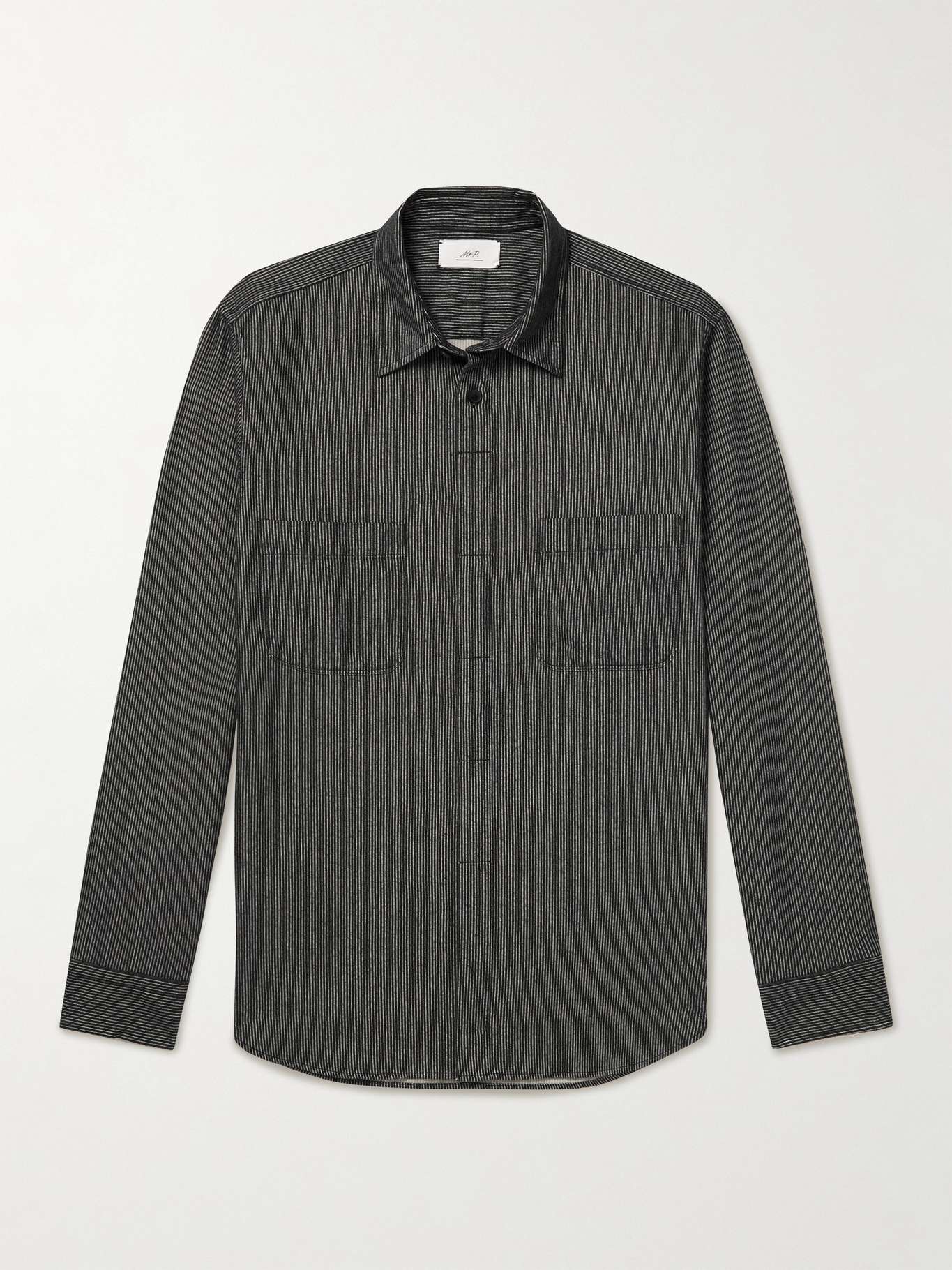 DESIGNED BY MR PORTER. Mr P. focuses on quality craftsmanship and simple, timeless design, so you can wear pieces like this pinstriped shirt for years to come. Made from soft cotton-flannel in a versatile black and white colourway, it has partially concealed horn buttons and a covered placket for a more streamlined look.