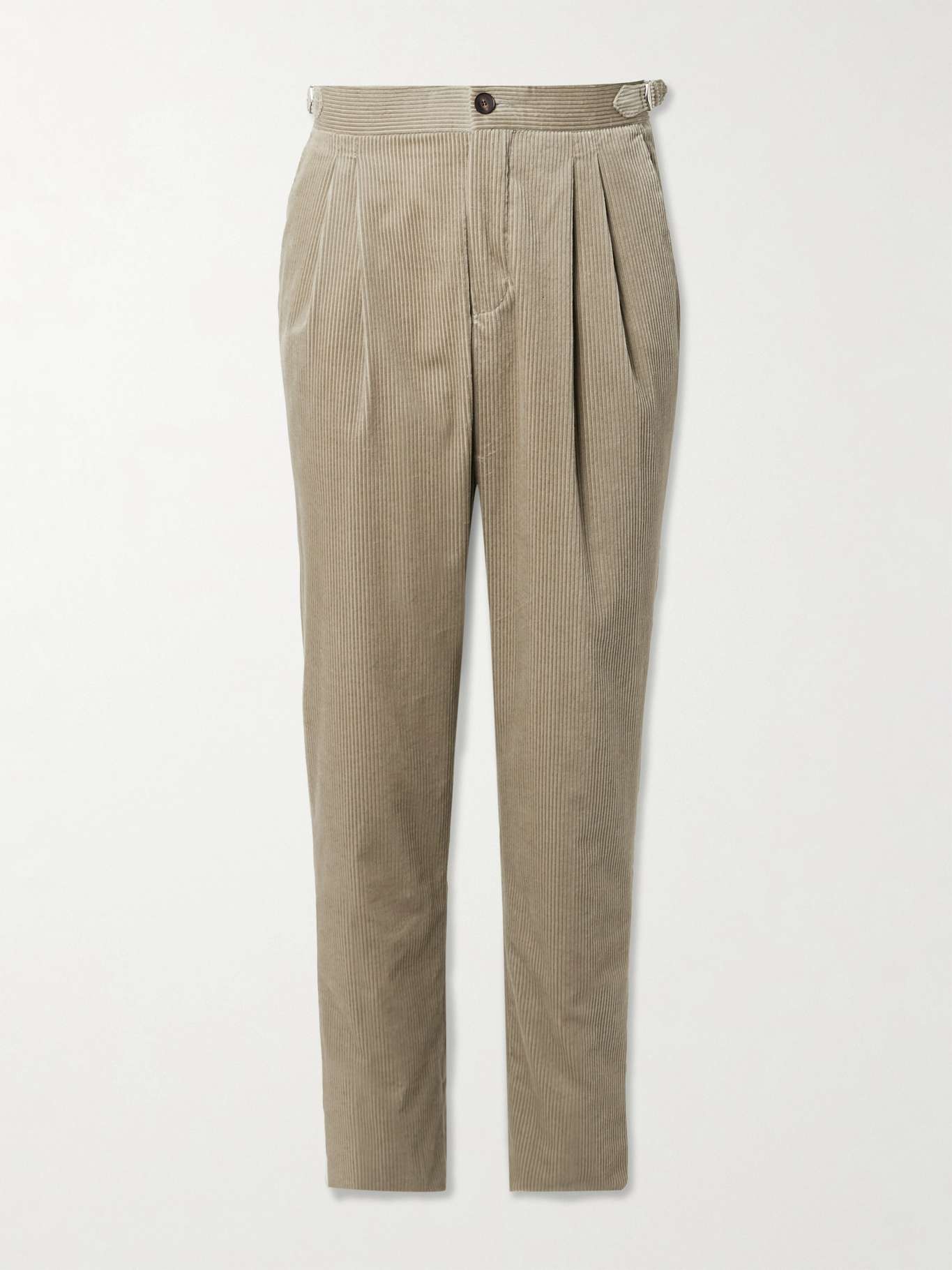 DESIGNED BY MR PORTER. Mr P.'s tuxedo trousers are tailored from plush corduroy, made from cotton enriched with a touch of rich cashmere. They're pleated from the waistband to create space through the straight legs. Use the adjusters to find your best fit.