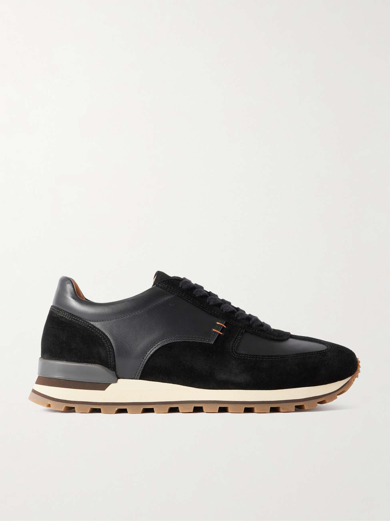 DESIGNED BY MR PORTER. Mr P.'s 'Carlos' sneakers are inspired by runners from the 1970s. Set on retro gum rubber soles, they're made from panels of black leather and suede and have tonal topstitching.