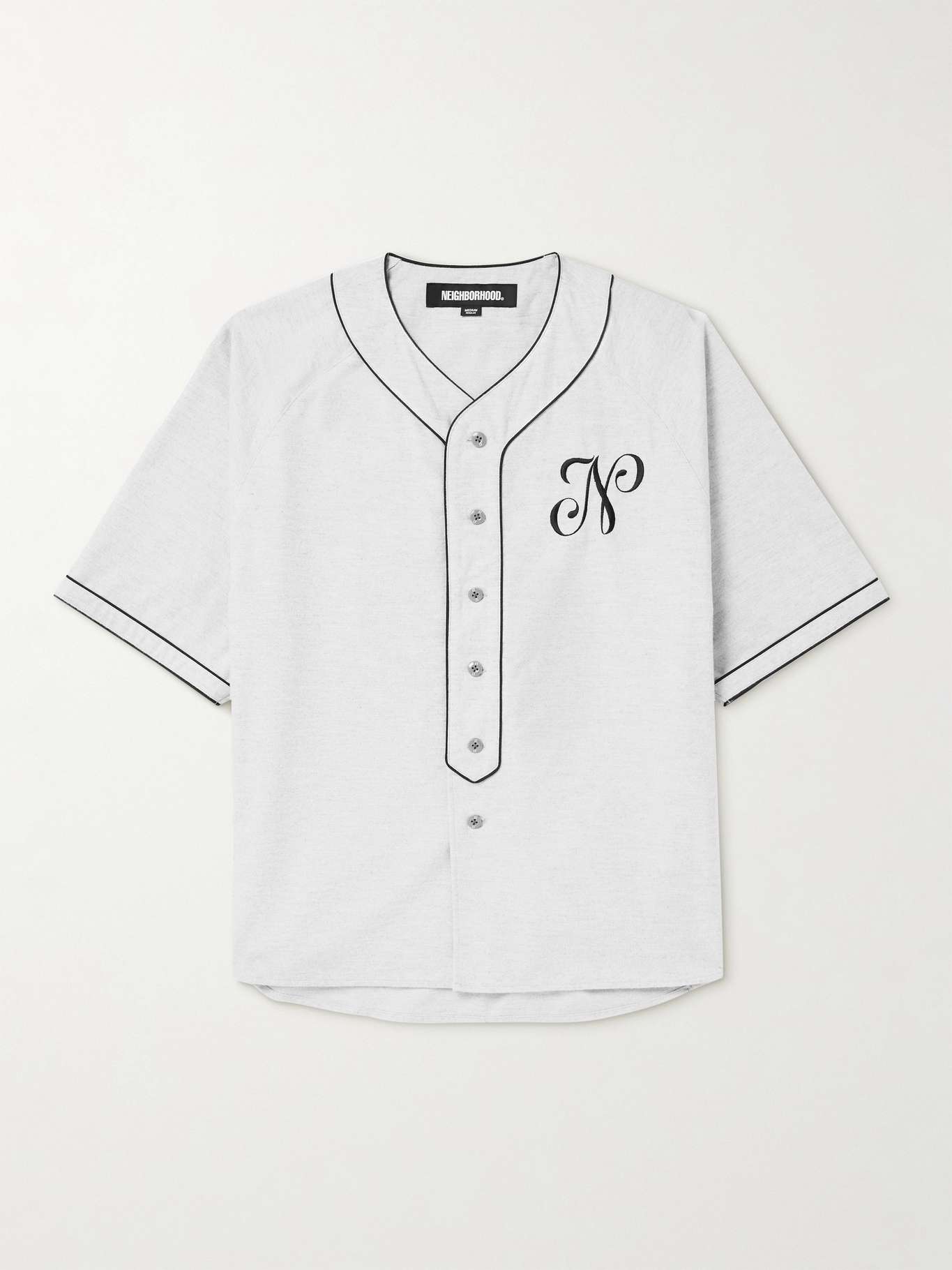 Japan's favourite sport is yakyū, or baseball, so it's no surprise its style has made it into Tokyo-based Neighborhood's collections. This shirt is made from soft cotton-jersey and has a wide front placket defined by contrasting trims. Note the embroidered script emblem on the chest.