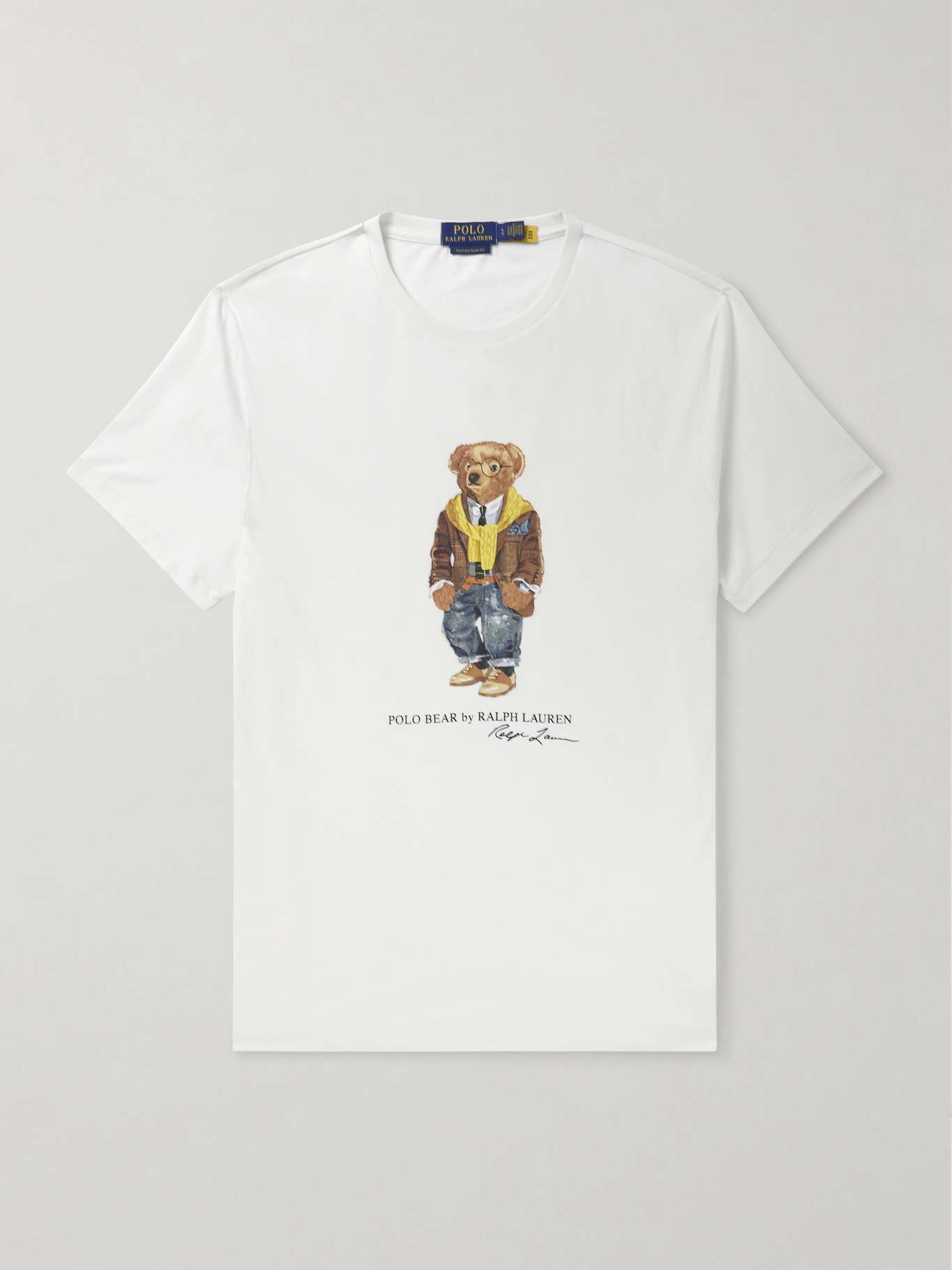 You can count on Polo Ralph Lauren's mascot to inspire your next outfit. On this cotton-jersey T-shirt, the 'Polo Bear' is dressed in cuffed denim with a Prince of Wales checked blazer and a sweater draped over his shoulders. Take notes.