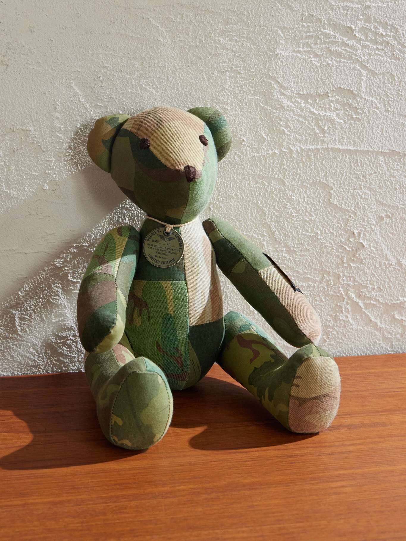RRL’s bear is crafted from contrasting camouflage fabrics that vary from piece to piece, making each one unique. Look closely and you’ll notice the logo embroidered on the left arm.