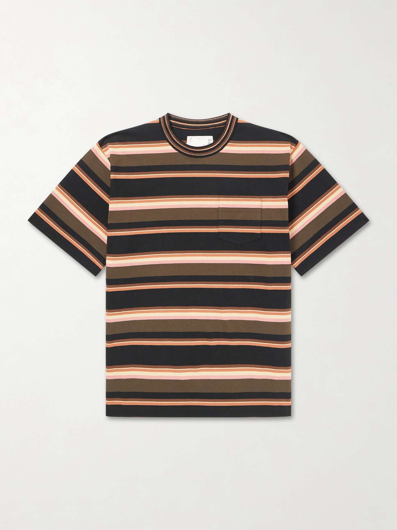 Sacai's T-shirt is striped with horizontal lines in earthy tones. It's cut for a classic fit from cotton-jersey with a patch pocket on the chest. Throw a flight jacket over the top.