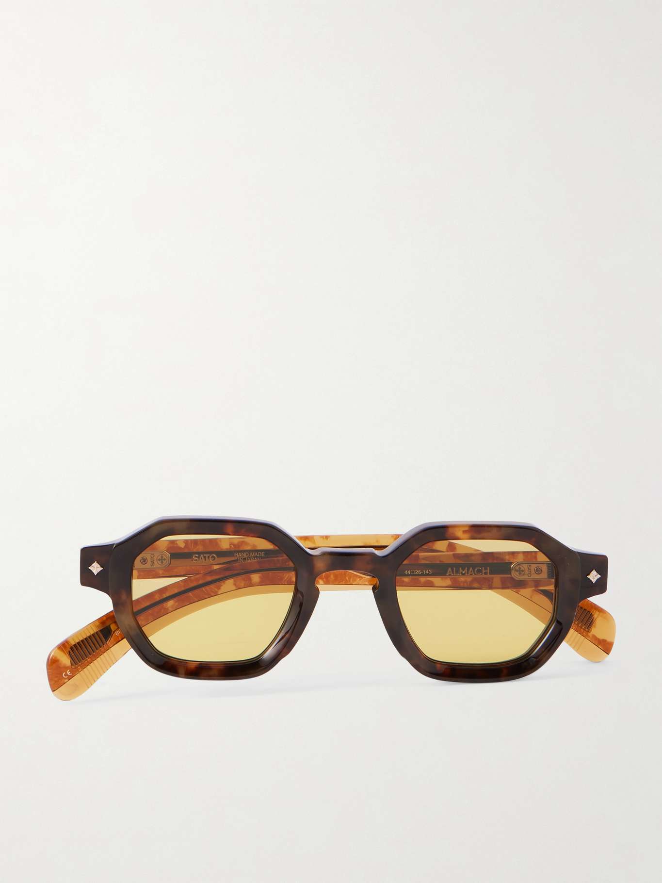 Inspired by '90s aesthetics, SATO's collections fuse past codes with a "fashion-forward mindset". These 'Almach' sunglasses have been meticulously crafted in Japan from tortoiseshell acetate and have geometric square frames. Etched gold-tone pins pierce the temples and arms.
