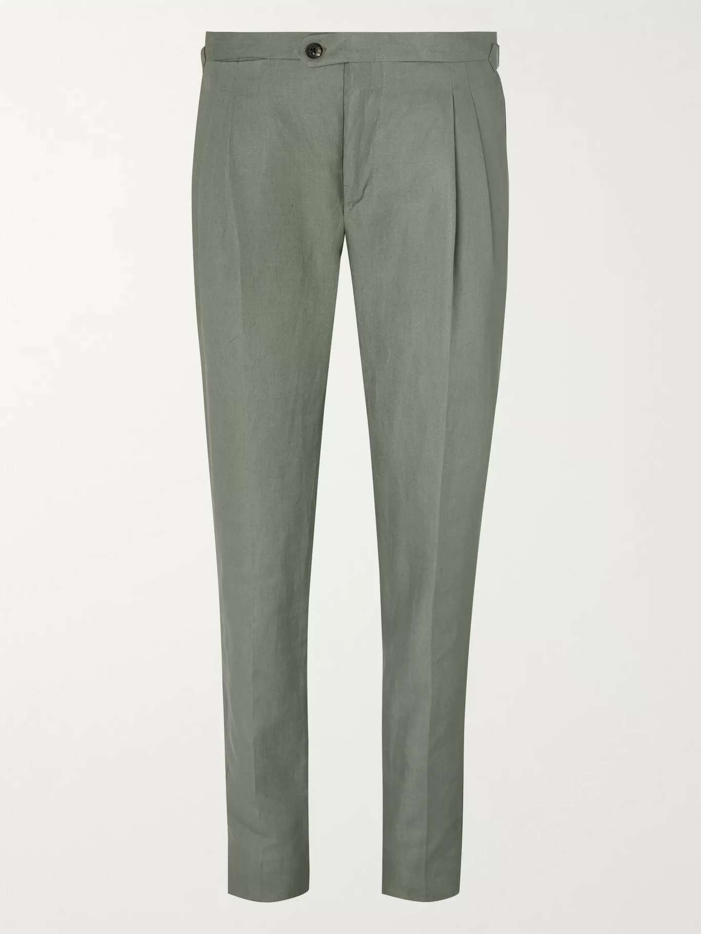 Thom Sweeney recommends styling these trousers with a knitted polo shirt, proving that they work just as well for casual days as they do formal occasions. They're tailored from crisp sage-green linen and have padstitched edges to maintain the tapered profile. Adjust the side tabs and have the unfinished hems altered to perfect the fit.