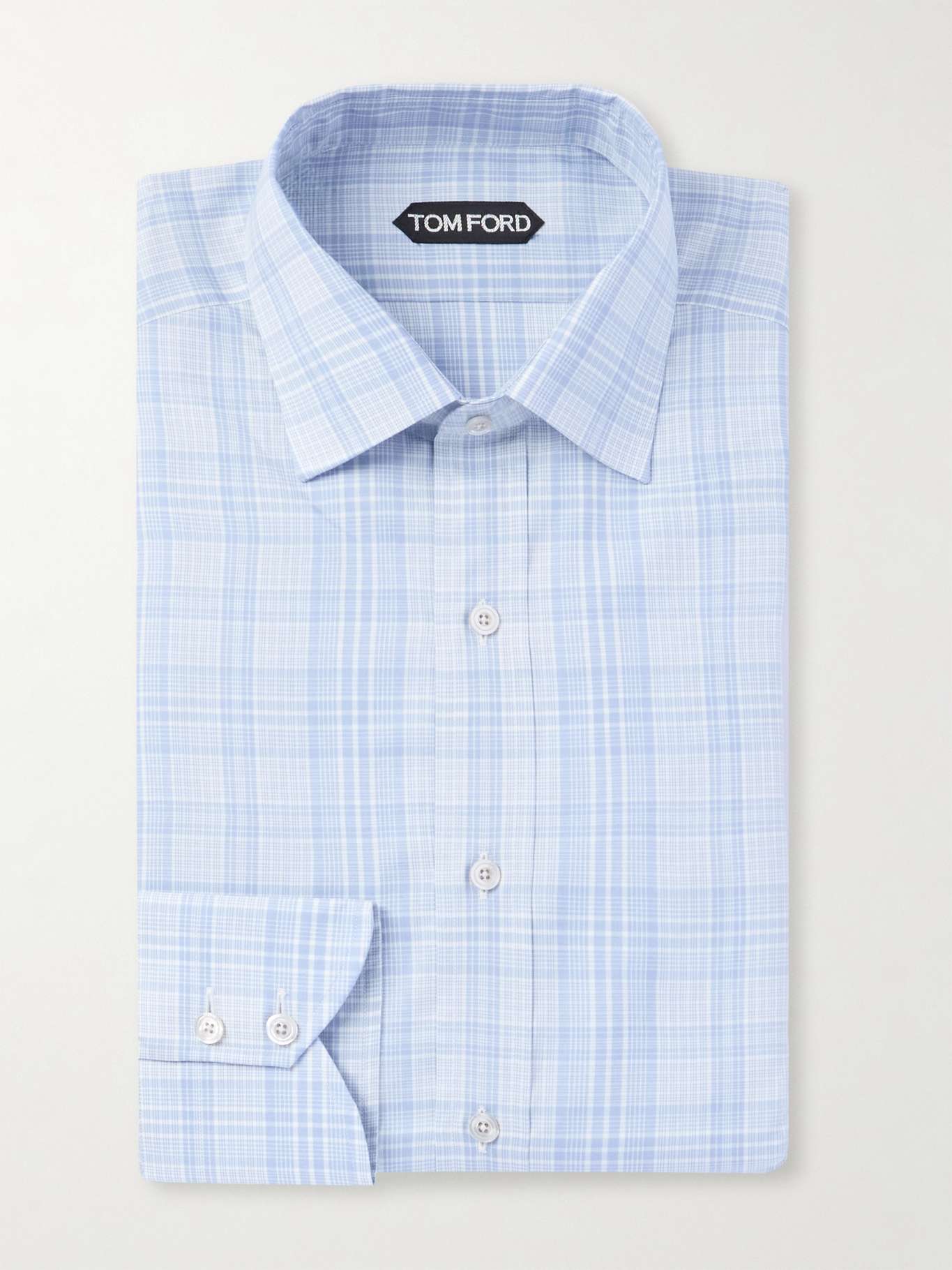 TOM FORD's shirt will work with smart and casual outfits alike. It's made from cotton-poplin woven with a subtle check and has mother-of-pearl buttons through the front placket. Wear it with light-wash jeans or tonal suiting.