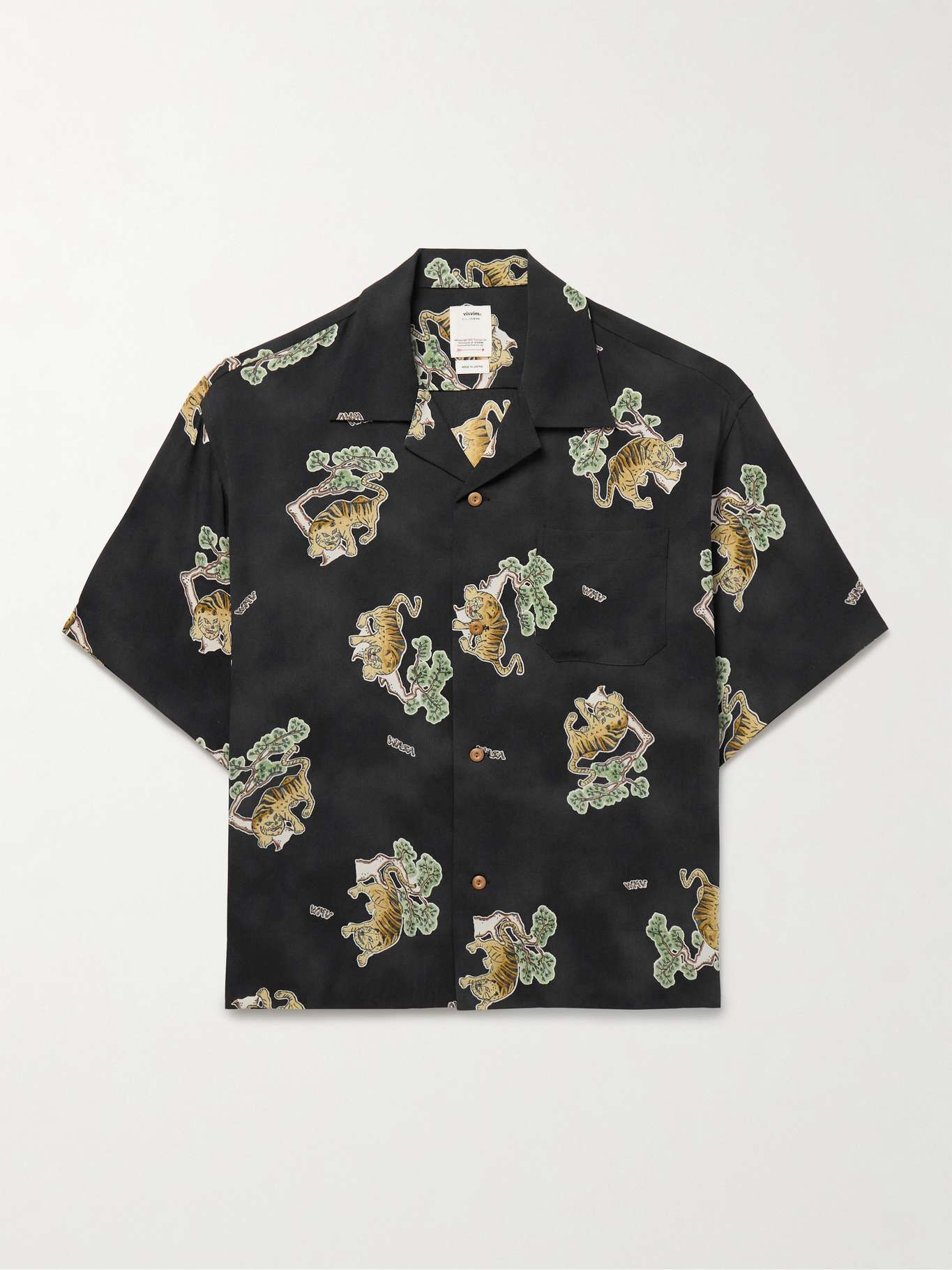 visvim's shirt is printed with prowling tigers between tree branches - the animal is considered to be a symbol of strength and protection. Ideal for warmer weather, it's cut from fluid silk crepe de chine and has a retro camp collar.