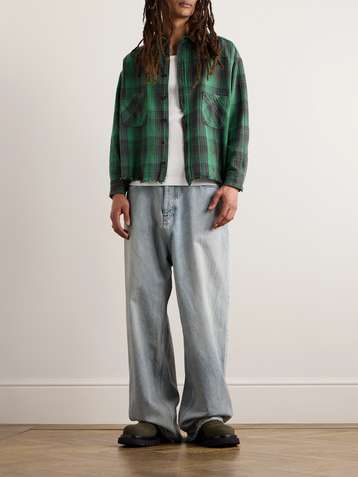 + LASTMAN Convertible-Collar Distressed Paint-Splattered Checked Oxford Shirt