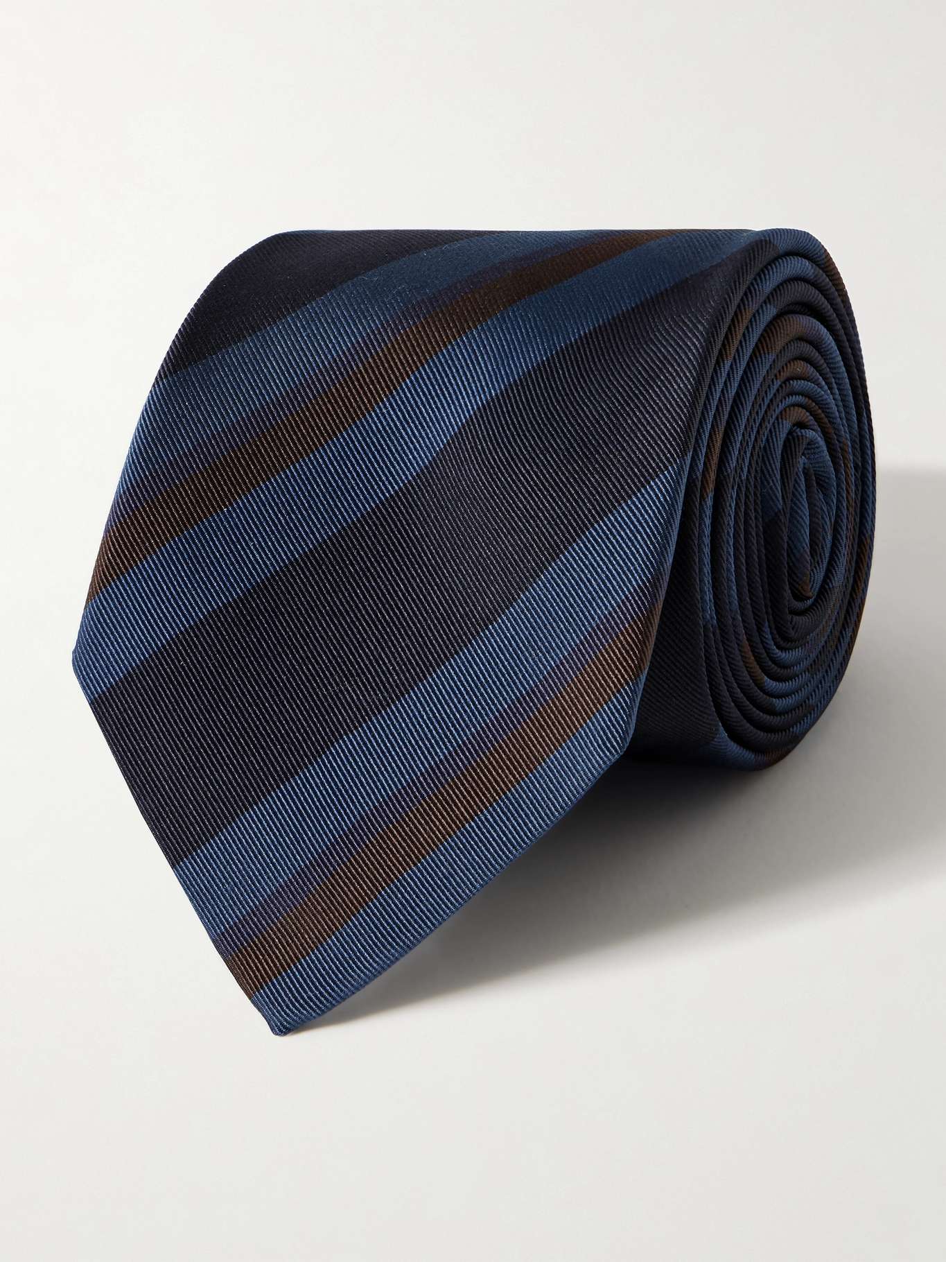 Drake's tie is woven with stripes of varying colours and widths, adding interest to plain suiting. It’s been made in the UK from a silk and cotton-blend twill that has a subtle lustre.