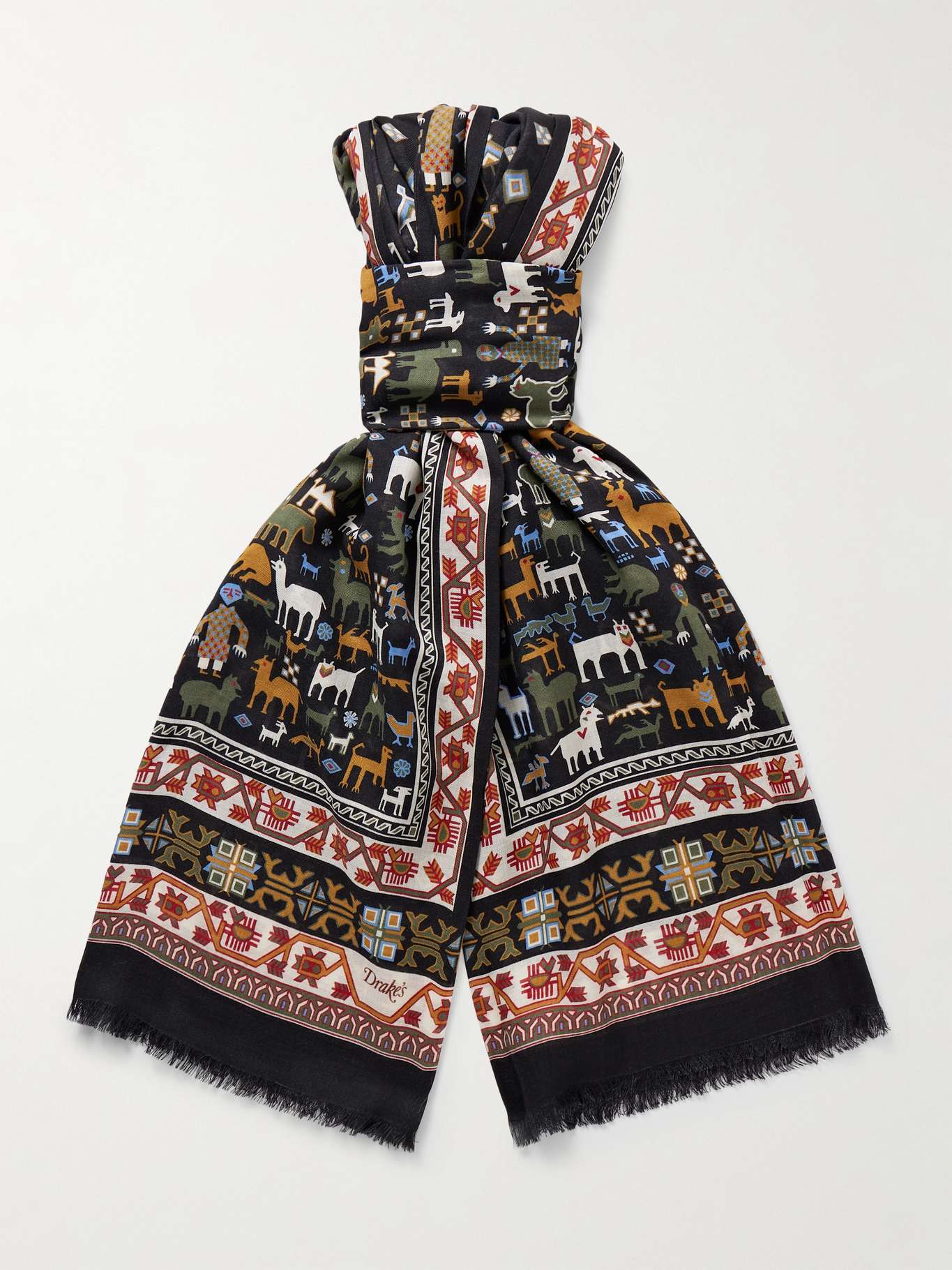Printed scarves were the first items of clothing Drake's produced when it was founded in 1977. This style is richly detailed, with colourful illustrations of animals and geometric motifs. It's made from wool and silk-blend that's soft on the skin.
