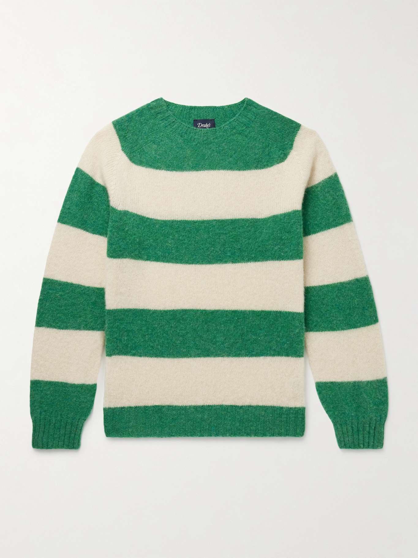 Drake's sweater has been created in collaboration with HIM - an initiative geared towards mental health and wellbeing. Knitted from soft wool, it's patterned in green and cream stripes and traced with ribbed trims.