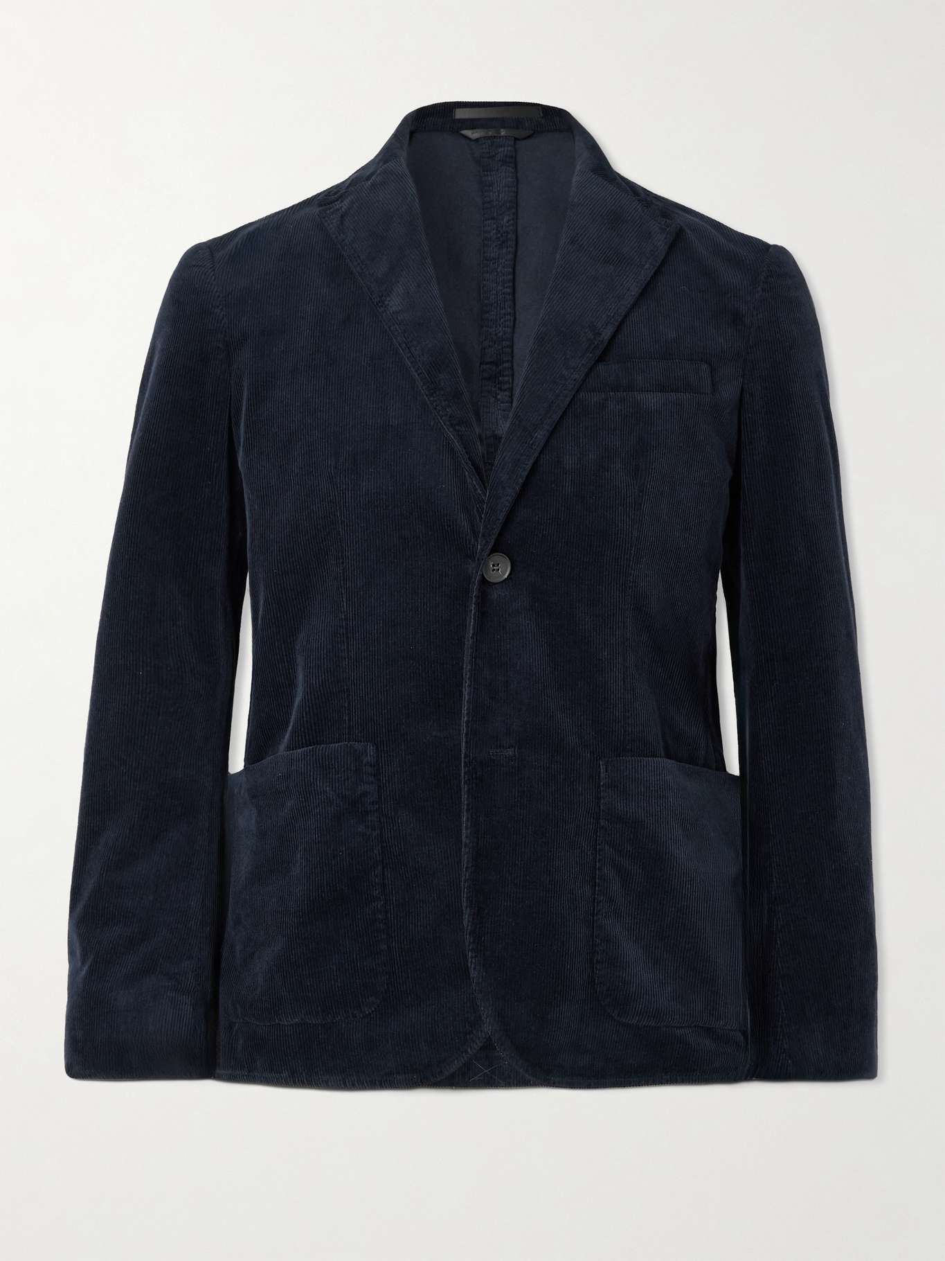 Sunspel’s blazer is tailored from plush cotton-blend corduroy, which reflects the light beautifully. It’s framed by elegant notch lapels and has a single vent in the back to minimize wrinkling when seated.