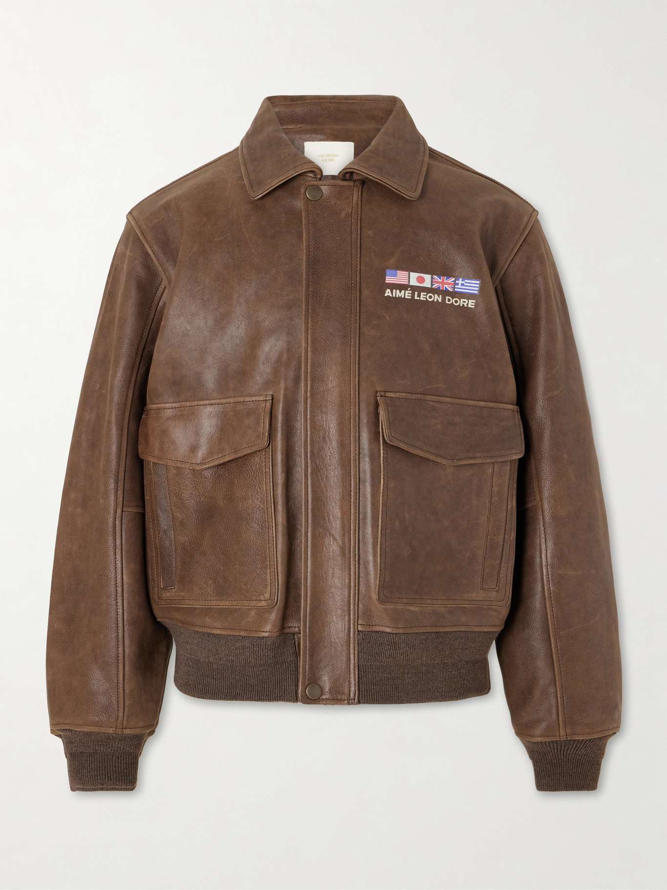Drawing on aviation codes, Aimé Leon Dore's flight jacket is cut from leather that develops a naturally lived-in patina over time. The tailored yet relaxed fit is complemented by 'The World's Borough' back print and front flag motifs, while a zip fastening and double front pockets add utility.