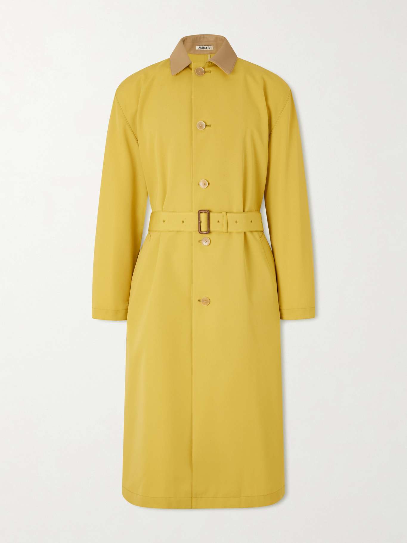 Rendered in a soft yellow hue, Auralee’s trench coat brings a touch of whimsy to the classic silhouette. Tailored from densely woven wool-canvas, it’s topped with a leather collar and finished with tonal buttons and the style’s signature belt.