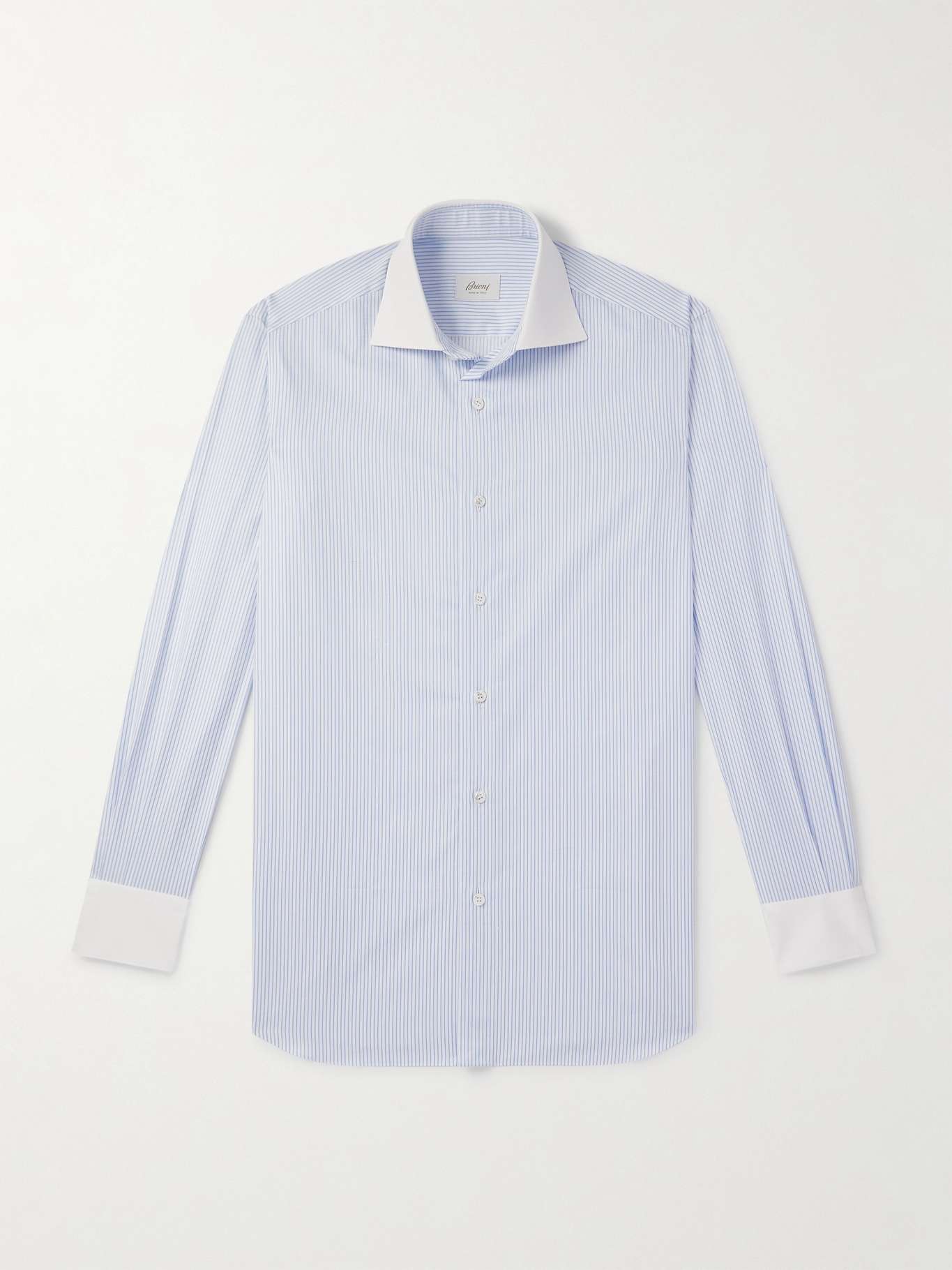 Brioni opened the Scuola di Alta Sartoria to preserve the art of tailoring for future generations. This shirt has been expertly made in Italy from cotton-poplin patterned with neat stripes and has a contrasting white collar and cuffs.