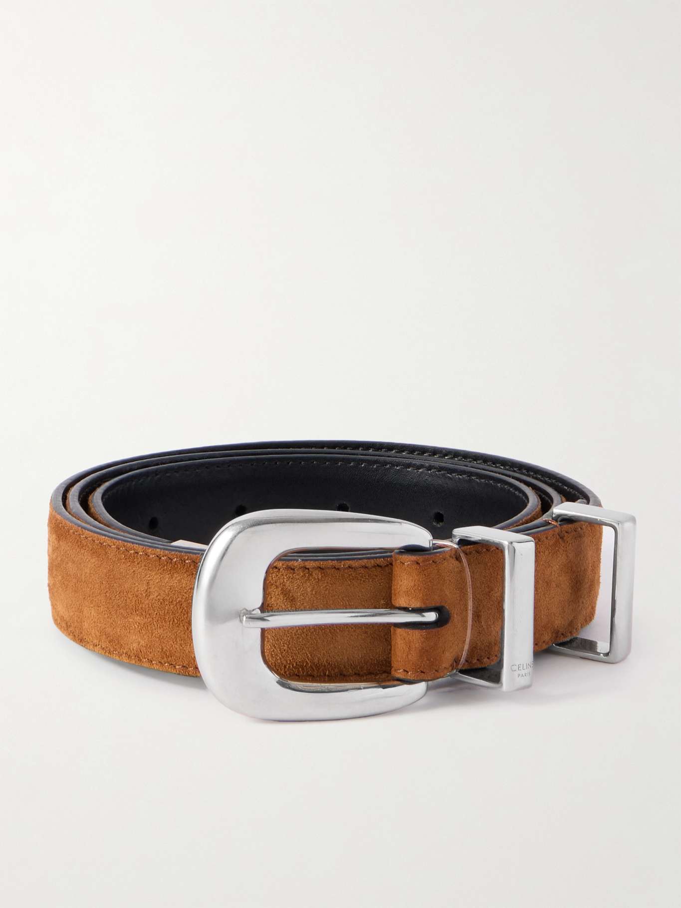 CELINE HOMME's belt is made from suede that has a rugged, textured feel to it. It's accented by silver-tone hardware of a rounded buckle and pointed end. Style yours with slim jeans and Western boots.