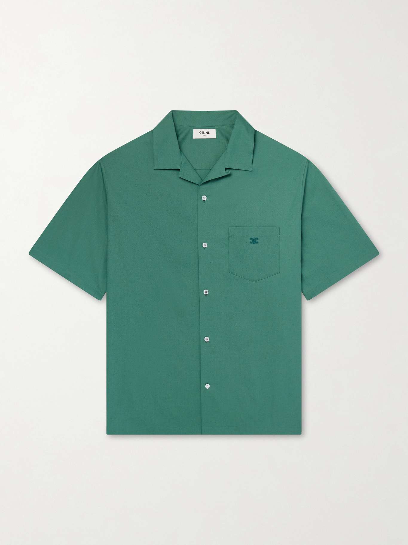 CELINE's green camp-collar shirt is cut from a cotton and linen-blend and features a tonal logo embroidery at the chest pocket. Mother-of-pearl buttons stand out against the fabric, while the loose fit offers a light, airy feel.
