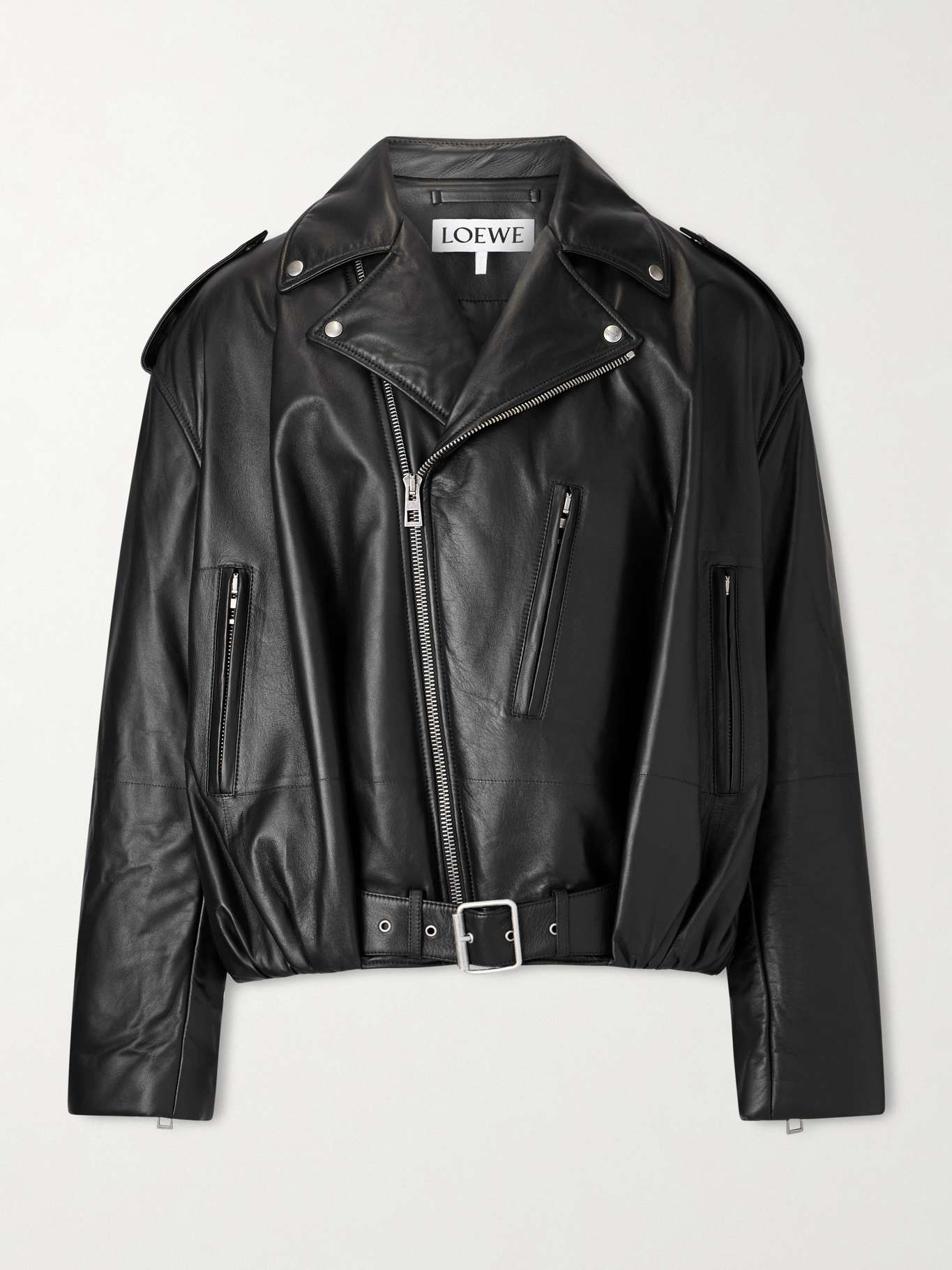 Loewe's jacket is defined by it's cocooning, balloon-like silhouette — the result of loose sleeves and a gathered hem. It's crafted from supple nappa leather and has classic moto details, including an asymmetric front, epaulettes, zipped pockets and an integrated belt. The generous proportions make it perfect for layering over hoodies.