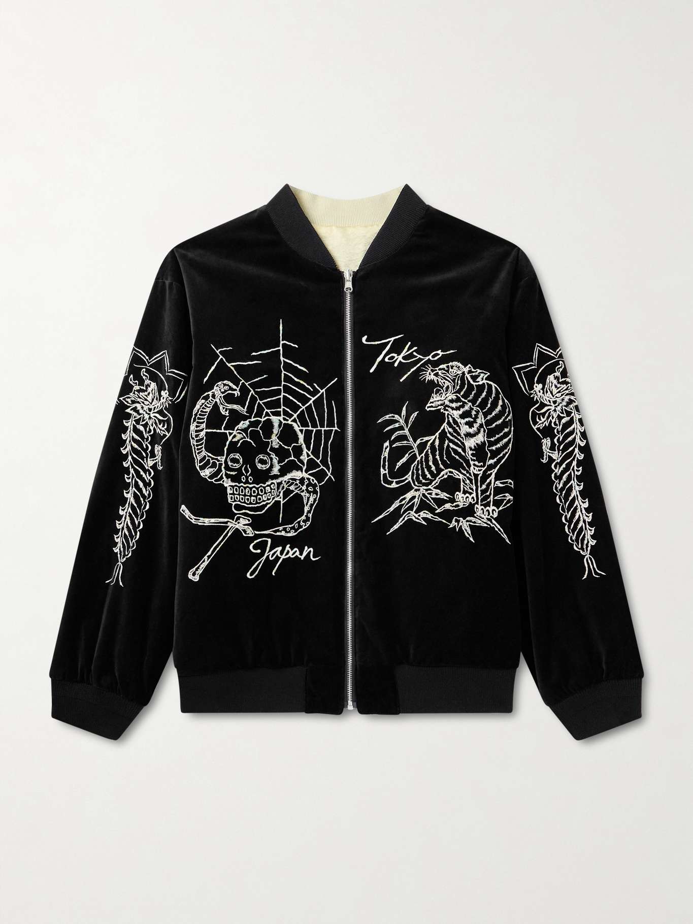 Neighborhood's reversible jacket draws inspiration from vibrant styles found in Japanese gift shops. One side is crafted from plush cotton-velvet, while the other features smooth satin. It's adorned with detailed embroidery showcasing a tiger, a skull and a spiderweb.