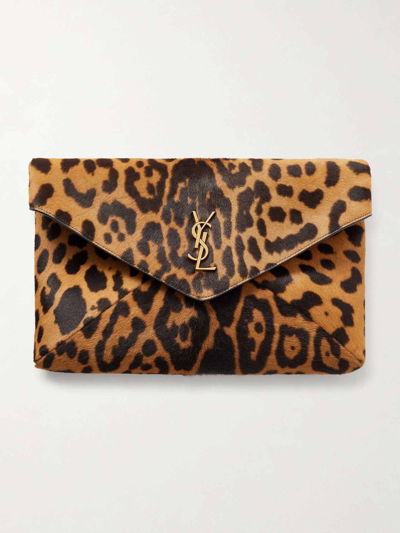 SAINT LAURENT's pouch is a sharp, statement-making take on everyday accessories. Made in Italy from leopard-print calf hair, it's finished with the signature 'Cassandre' logo and a sleek flap closure that keeps the silhouette streamlined. It's ideal for organising essentials or wearing solo for the most impact.