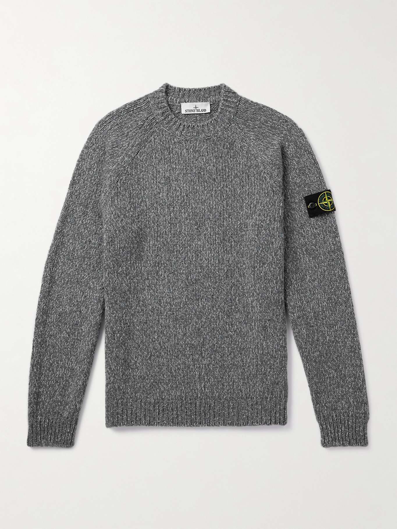 Stone Island's sweater is made using a vanisé technique, where contrasting yarns are stitched together for depth of colour. It's rib-knitted with seven-gauge wool and has a high neckline, raglan sleeves and a signature compass patch.