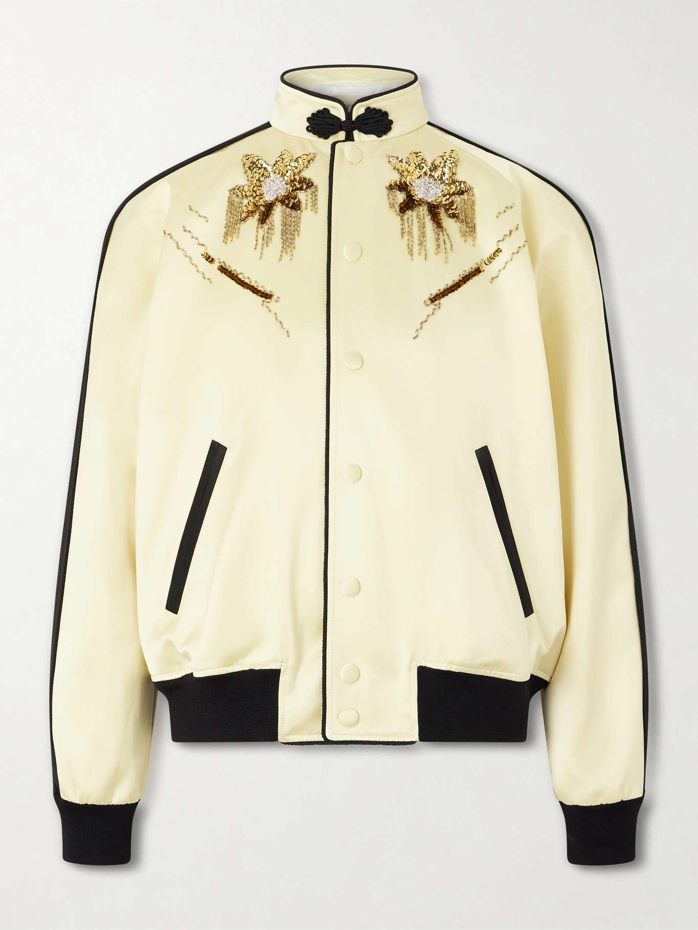 Somewhere between a casual bomber and a refined Mandarin-collar jacket, Valentino Garavani's design is made from lustrous, pastel-yellow satin. It's embellished with beads and sequins, while black cord detailing adds striking contrast and texture.