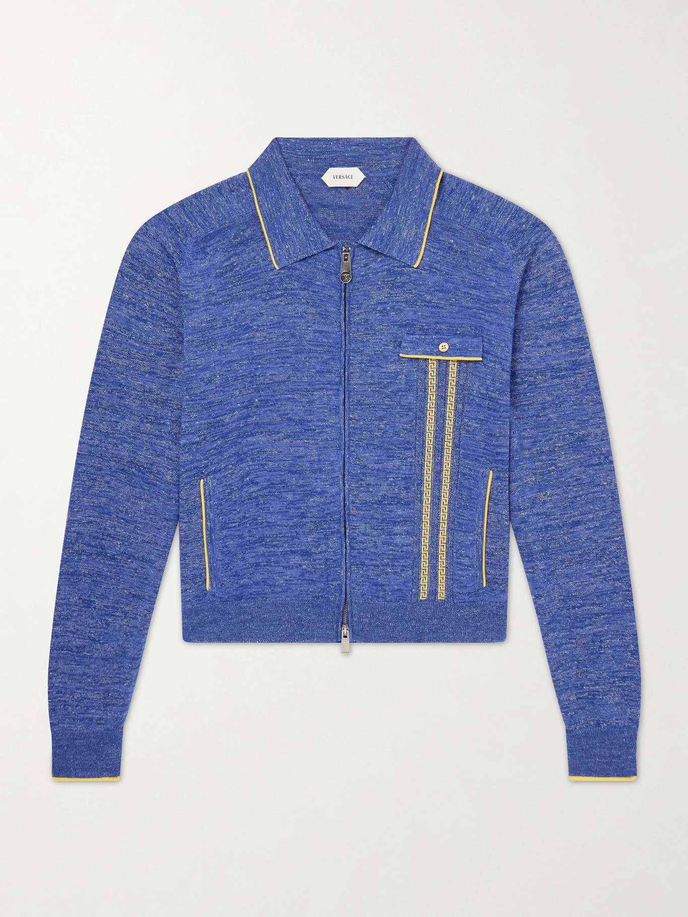Versace’s zip-up sweater combines rich texture with signature detailing. Knitted in a mouliné texture with hints of wool, silk and linen, it features contrast trims, a jacquard 'Greca' pocket and a 'Medusa' zip pull for a distinctive finish.