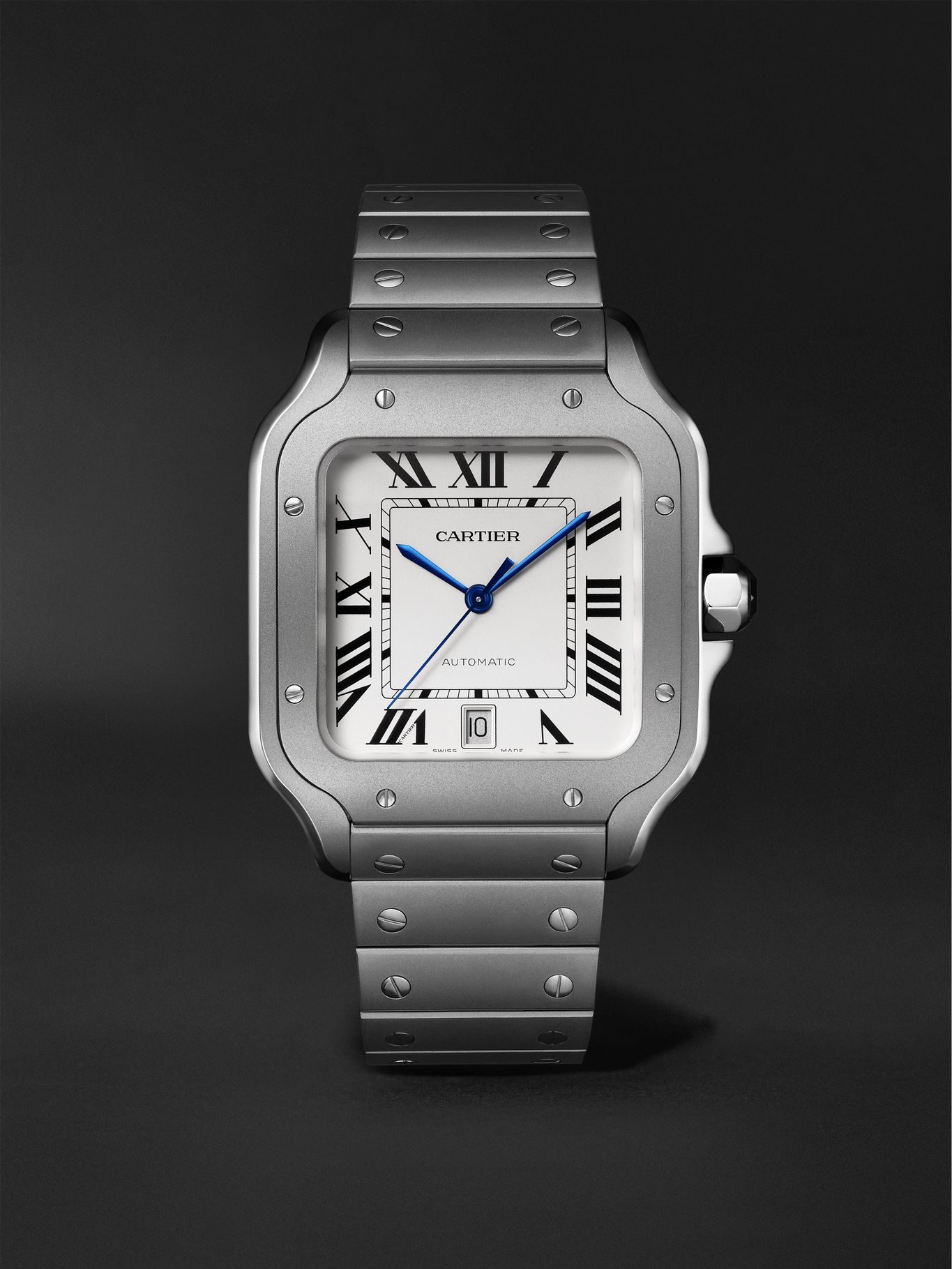 In 1904 Louis Cartier created the iconic Santos de Cartier watch so that his friend, the Brazilian aviator Alberto Santos Dumont, would be able to effortlessly tell the time whilst flying. Powered by a calibre 1847 MC automatic movement, this large model has a 47.5mm titanium case and handsome white dial complete with classic Roman numerals and a date window. The bracelet is equipped with the 'SmartLink' adjustment system while the 'Quickswitch' construction allows you to easily swap it out for the additional nubuck alligator strap.