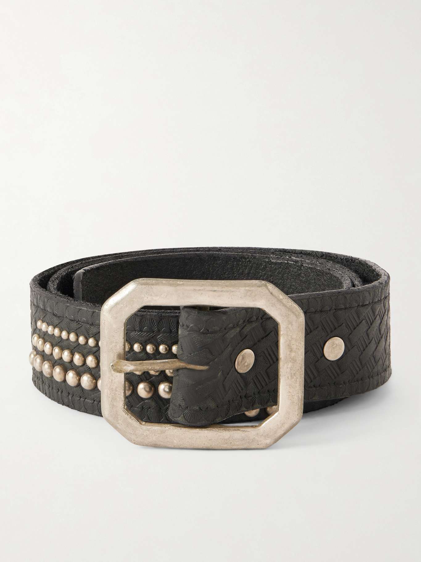 Pay extra attention to the textured leather on Cherry Los Angeles' belt - it's stamped with a woven pattern with fanned-out shapes along the edges. The antiqued buckle and studding give it a timeworn finish.
