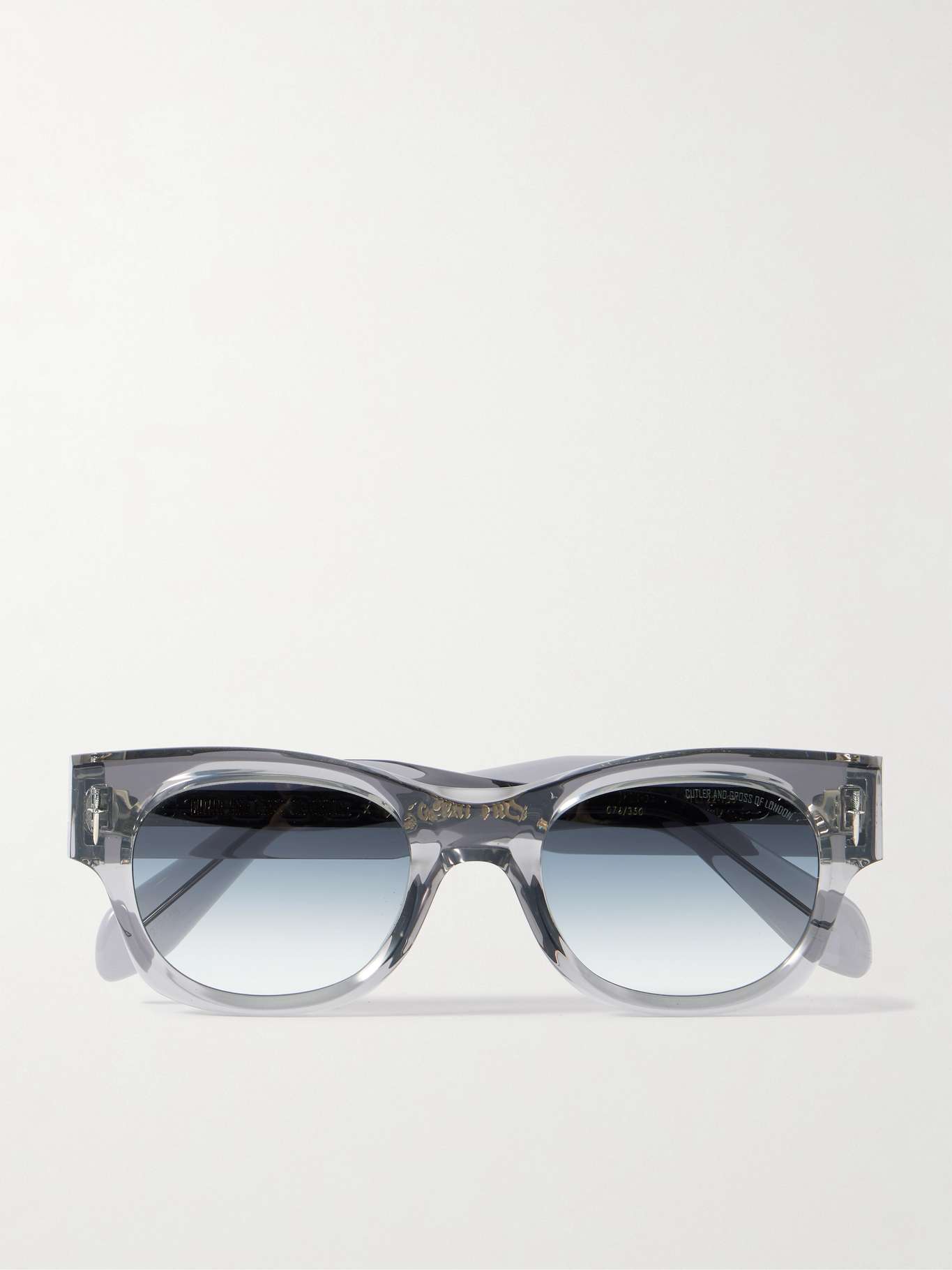 Cutler and Gross' 'Halen' sunglasses have dagger pins and 'Lock Down Chain' emblems at the temples, courtesy of London jewellery brand The Great Frog. Part of a limited run of 250, they’ve been made in Italy from 'Smoke Quartz' acetate and are fitted with gradient lenses.