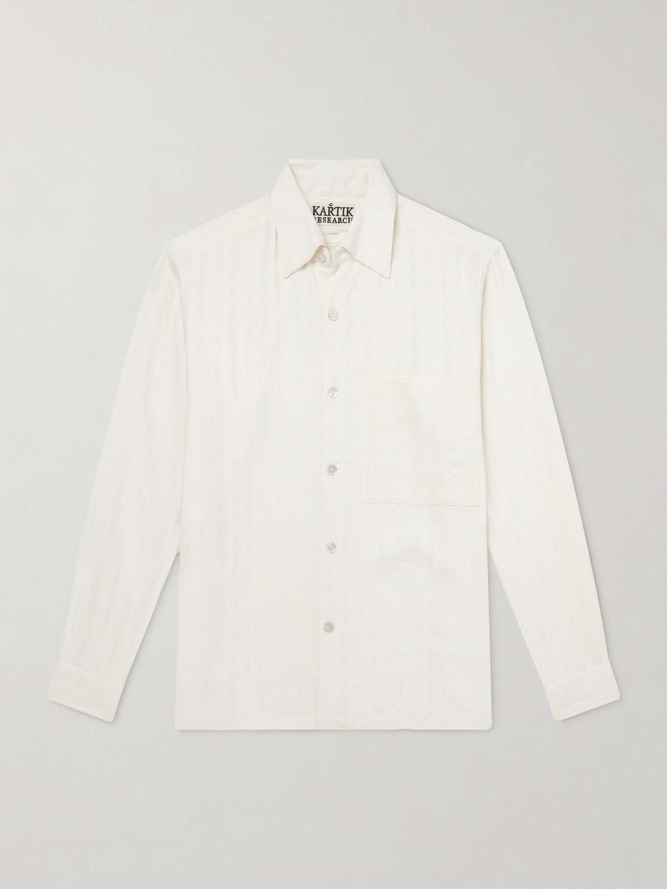 Rooted in traditional Indian craftsmanship, Kartik Research works closely with artisans to reinterpret heritage textiles through a contemporary lens. This relaxed-fit shirt is cut from handspun ‘Matka’ silk with a fluid drape and a softly striped texture that moves naturally with the body. Finished with an oversized chest patch pocket and mother-of-pearl buttons, its nuances are best appreciated up close.