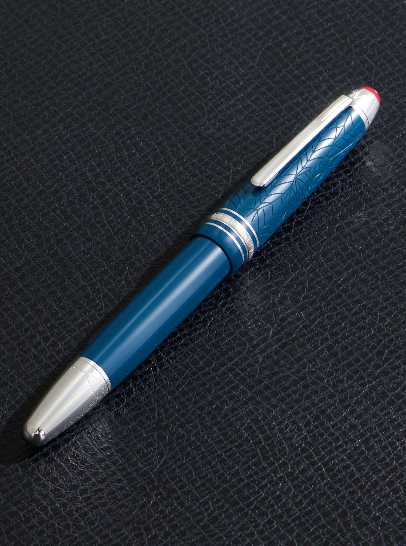 Inspired by Shakespeare's tragic love story, Montblanc's 'Romeo & Juliet' rollerball pen has a resin barrel in a teal shade, a nod to the play's ethereal balcony scene. It's contrasted by platinum-coated metal with an elegant rose on the cap.