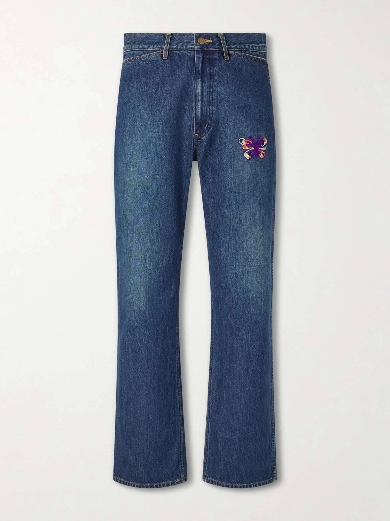 Needles' jeans are embroidered with its iconic 'Papillon' motif on the left leg. They're cut for a loose fit from 12 oz. denim and finished with camel-tone stitching.