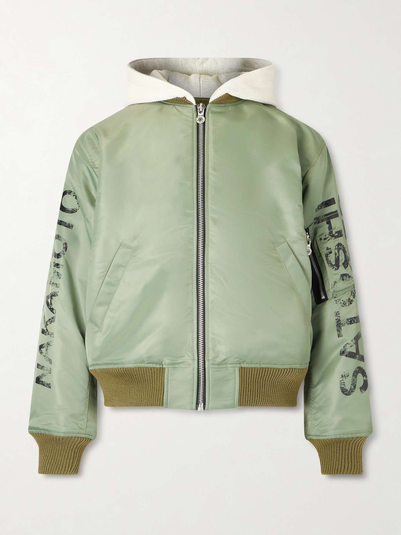 SATOSHI NAKAMOTO's 'Abandoned Theme Park' bomber jacket is airbrushed with a trippy graphic at the back. It's made from army-green shell with a cosy waffle-knit hood and ribbing at the edges.