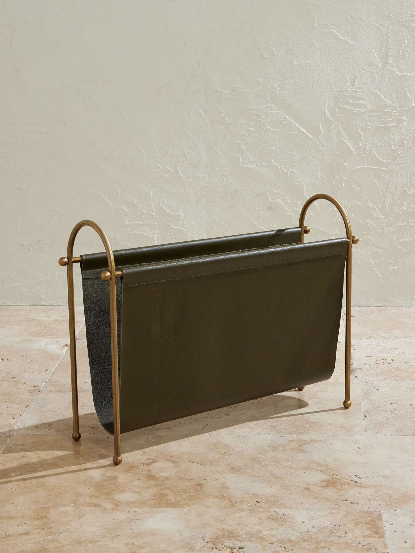 Soho Home's 'Meard' magazine rack is displayed throughout its renowned houses around the world. Ideal for organising books and magazines, it's handcrafted from antique-finish gold-tone brass and aged leather in an elegant army-green shade.