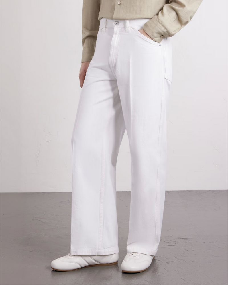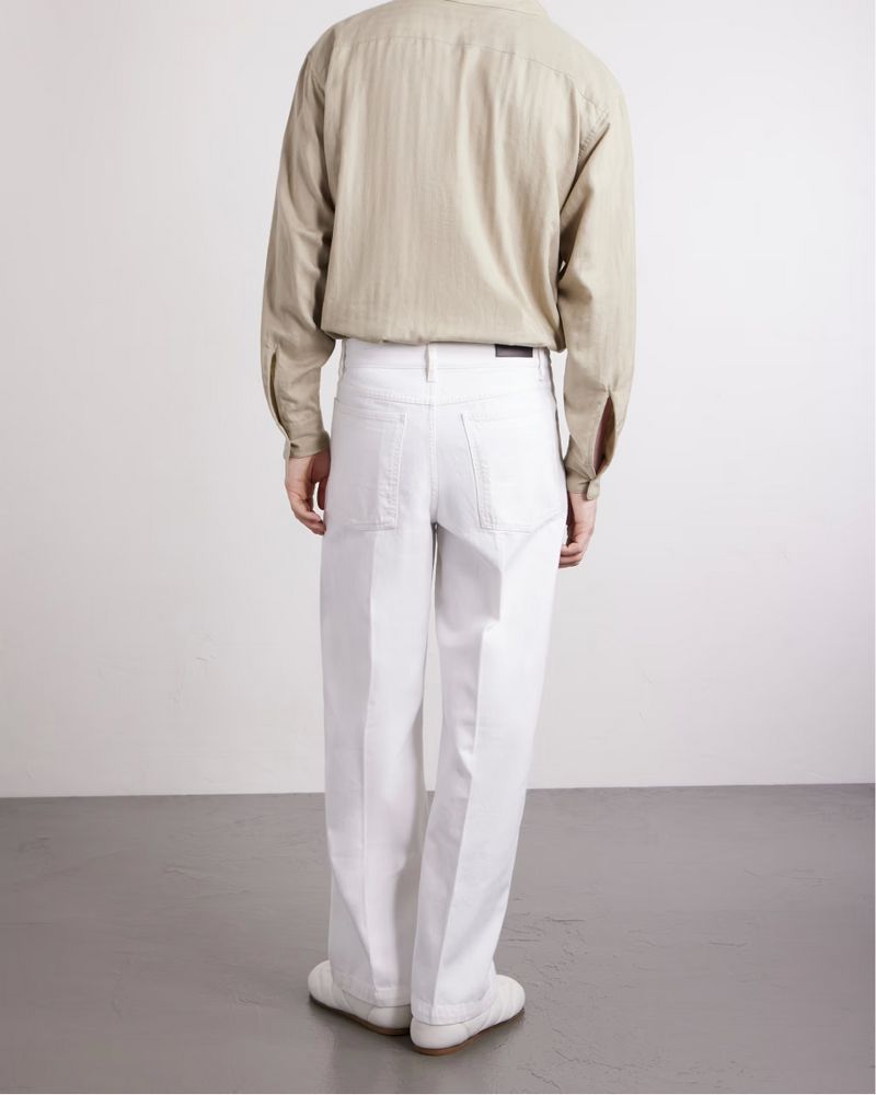 Larnyoh appreciates the adaptability of white denim, which can be dressed up or down. For easy style, he suggests “untucked poplin or Oxford shirts, slouchy cotton knits and a lightweight raincoat or blouson,” he says. “The beautiful thing about white denim is that it’s so neutral that it goes with absolutely any colour. I’d even be tempted to try a faded denim western-style shirt.”