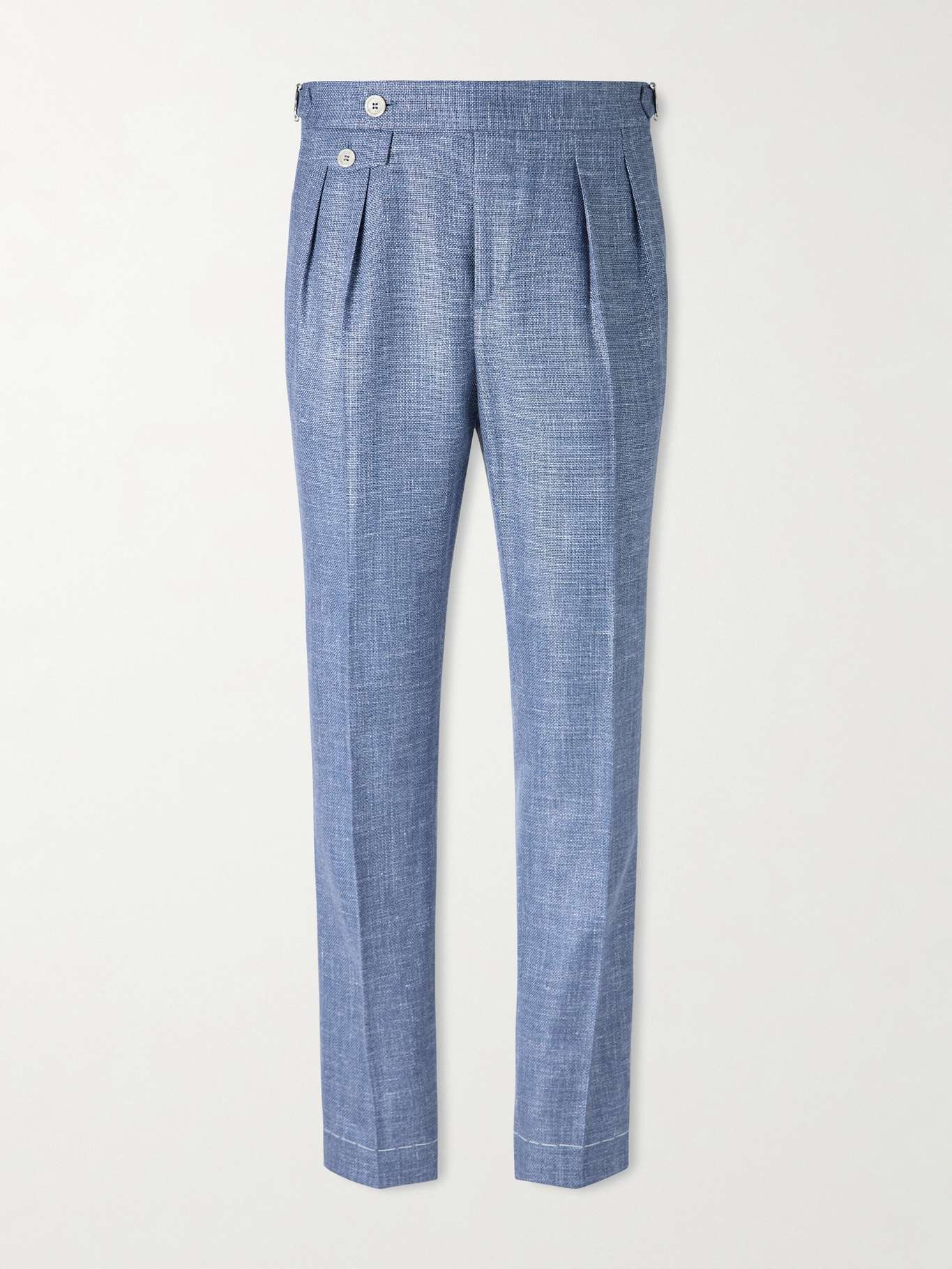 Brunello Cucinelli's suit trousers are made from a mix of some of the finest fibres in the world: virgin wool, cashmere, silk and linen. They've been tailored in Solomeo, Italy, with neat double pleats for room in the leg. Thanks to the buttoned side adjusters, you can leave your belt at home.