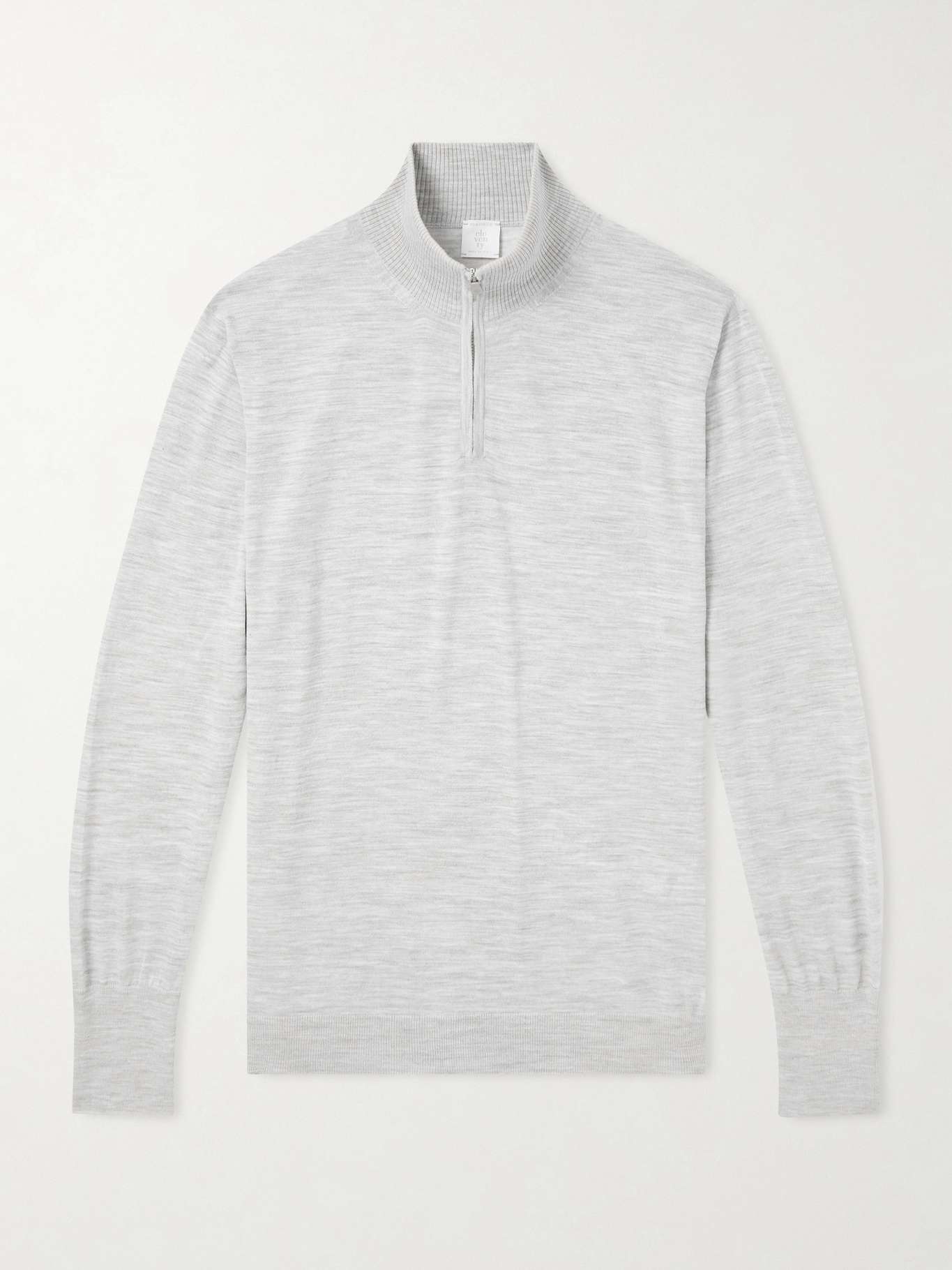 Eleventy’s half-zip sweater reflects the brand’s understated Italian refinement. Knitted from soft wool, it has a streamlined profile, while the stand collar introduces a practical, contemporary detail.