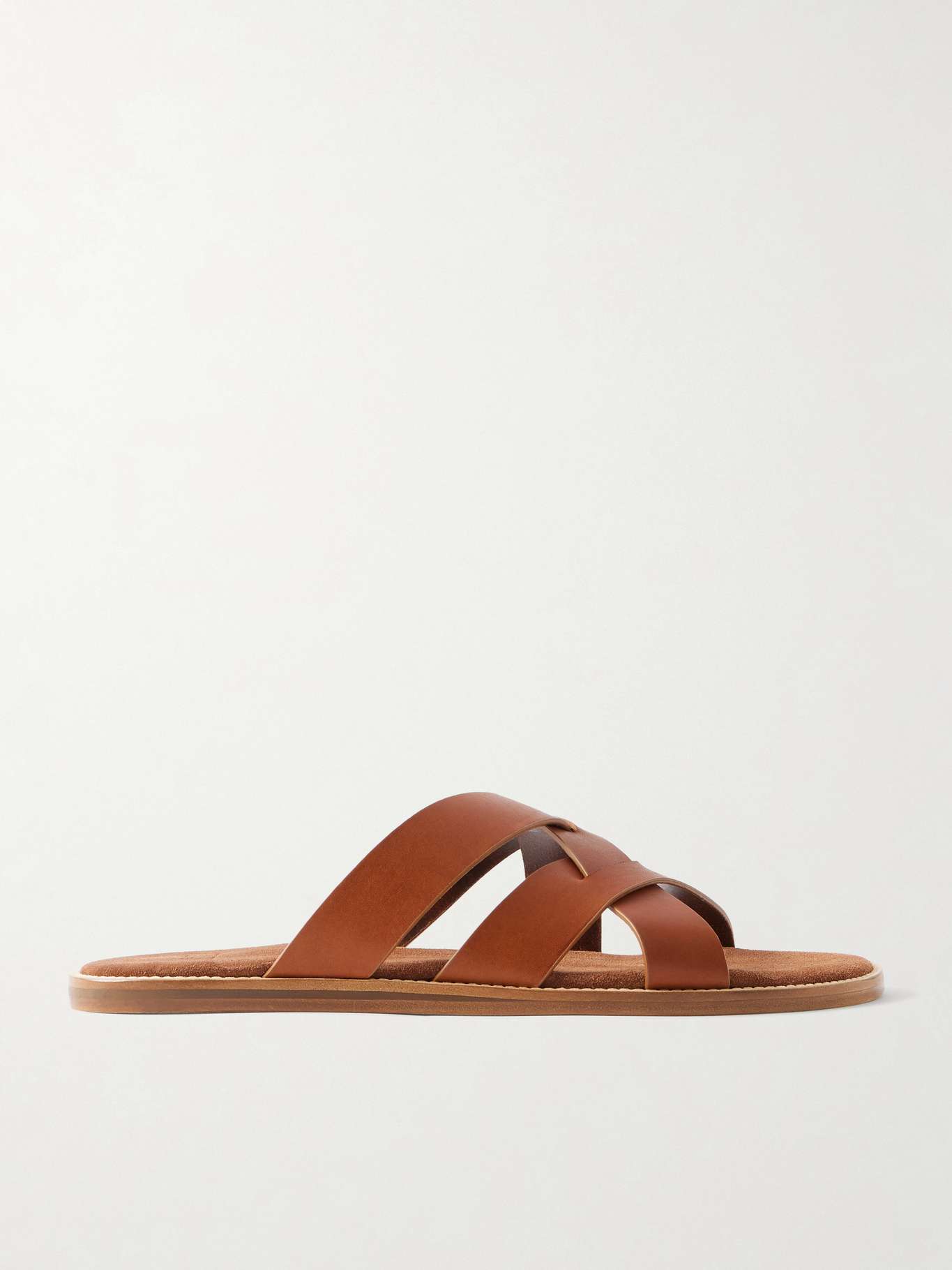DESIGNED BY MR PORTER. Mr P.’s crossover sandals are crafted in Italy from full-grain vegetable-tanned ‘vacchetta’ leather that will develop a rich patina over time. They feature wide crossover straps and a padded calf suede footbed for comfort, set on a stacked leather wedge sole that adds subtle height while keeping the look refined.