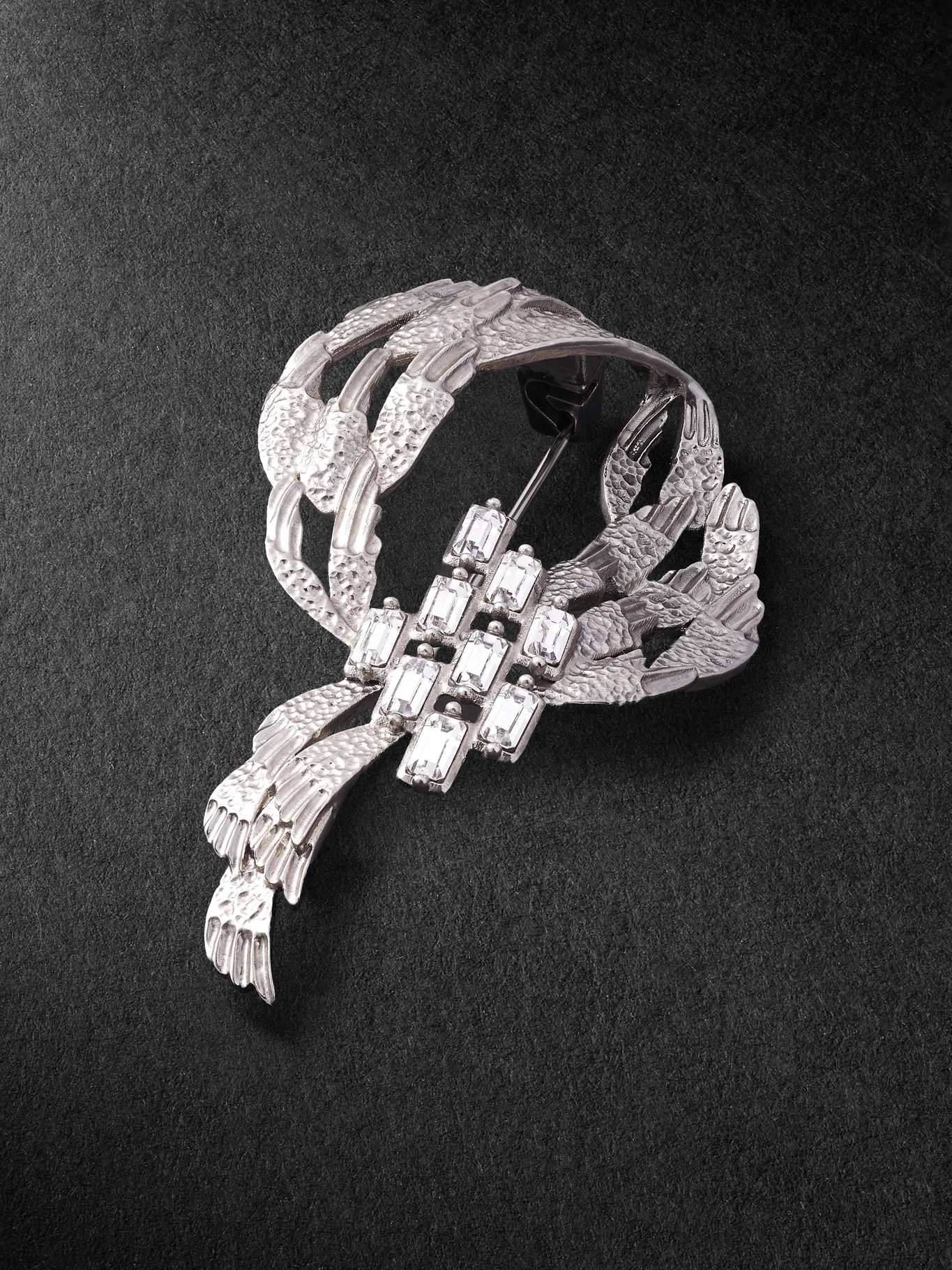 SAINT LAURENT's 'Cascade' brooch is crafted from silver-tone metal that's oxidized for an antique effect. It's set with glinting, emerald-cut crystals and features the iconic logo discreetly etched at the back. Pin it to the lapel of your favourite jacket.