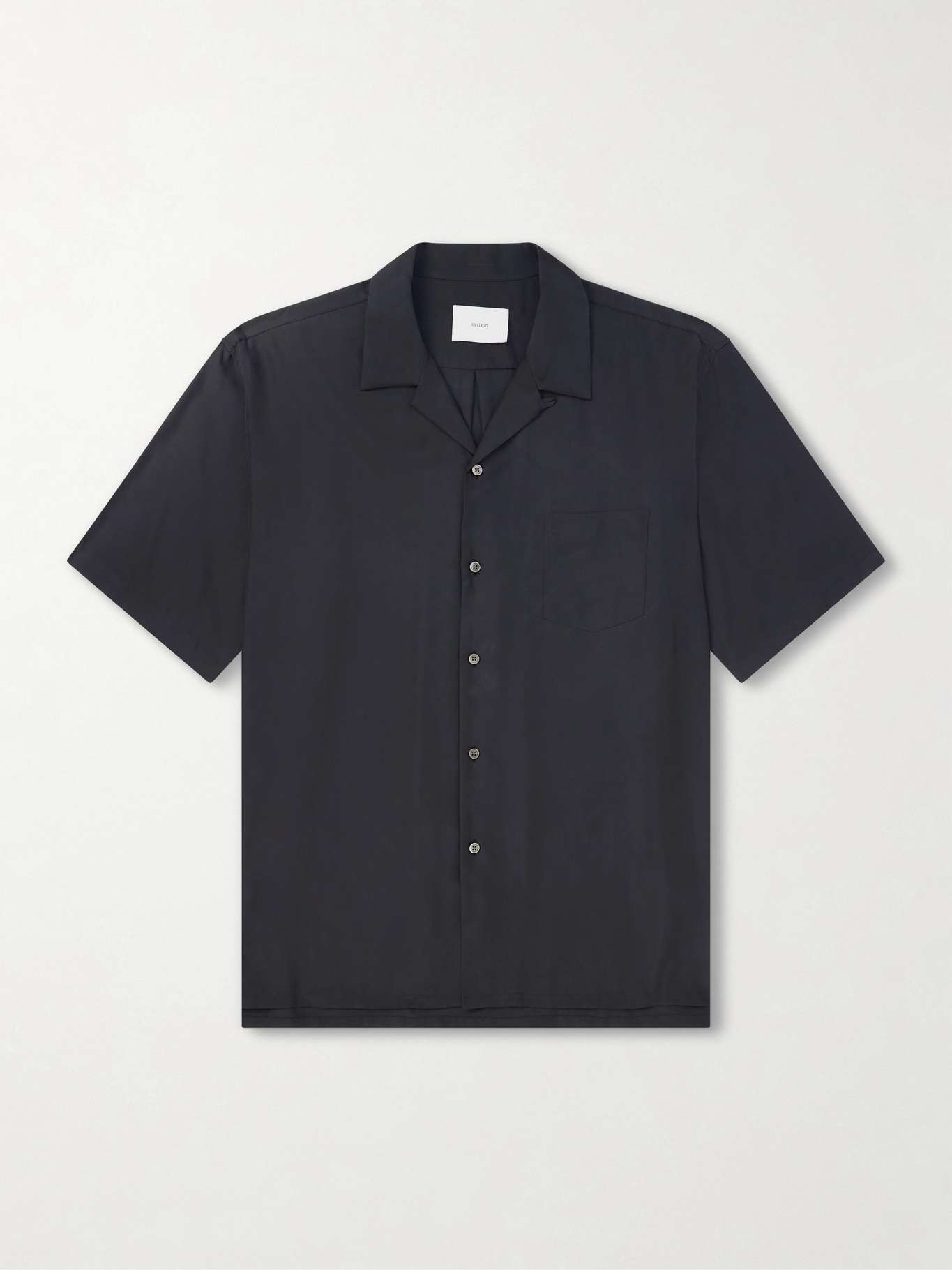 ssstein’s shirt is cut in a fluid, oversized fit from twill with a silky handle and gentle sheen. The convertible collar allows for varied styling—try it tucked in to shape its generous volume into a more sculptural silhouette.
