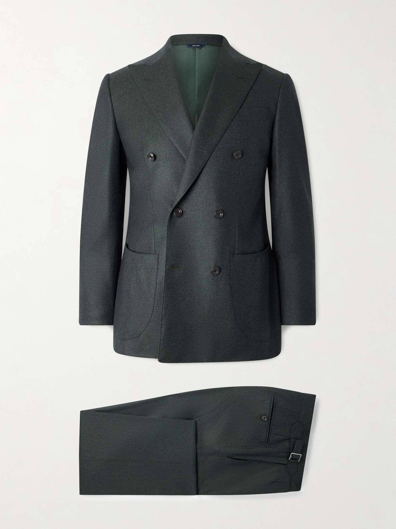 Thom Sweeney is led by Savile Row-trained tailors Thom Whiddett and Luke Sweeney. Inspired by the classic cool of old Hollywood, this double-breasted suit is tailored from warm wool in a versatile 'Charcoal Green' shade. Have the trousers adjusted to your preferred break.