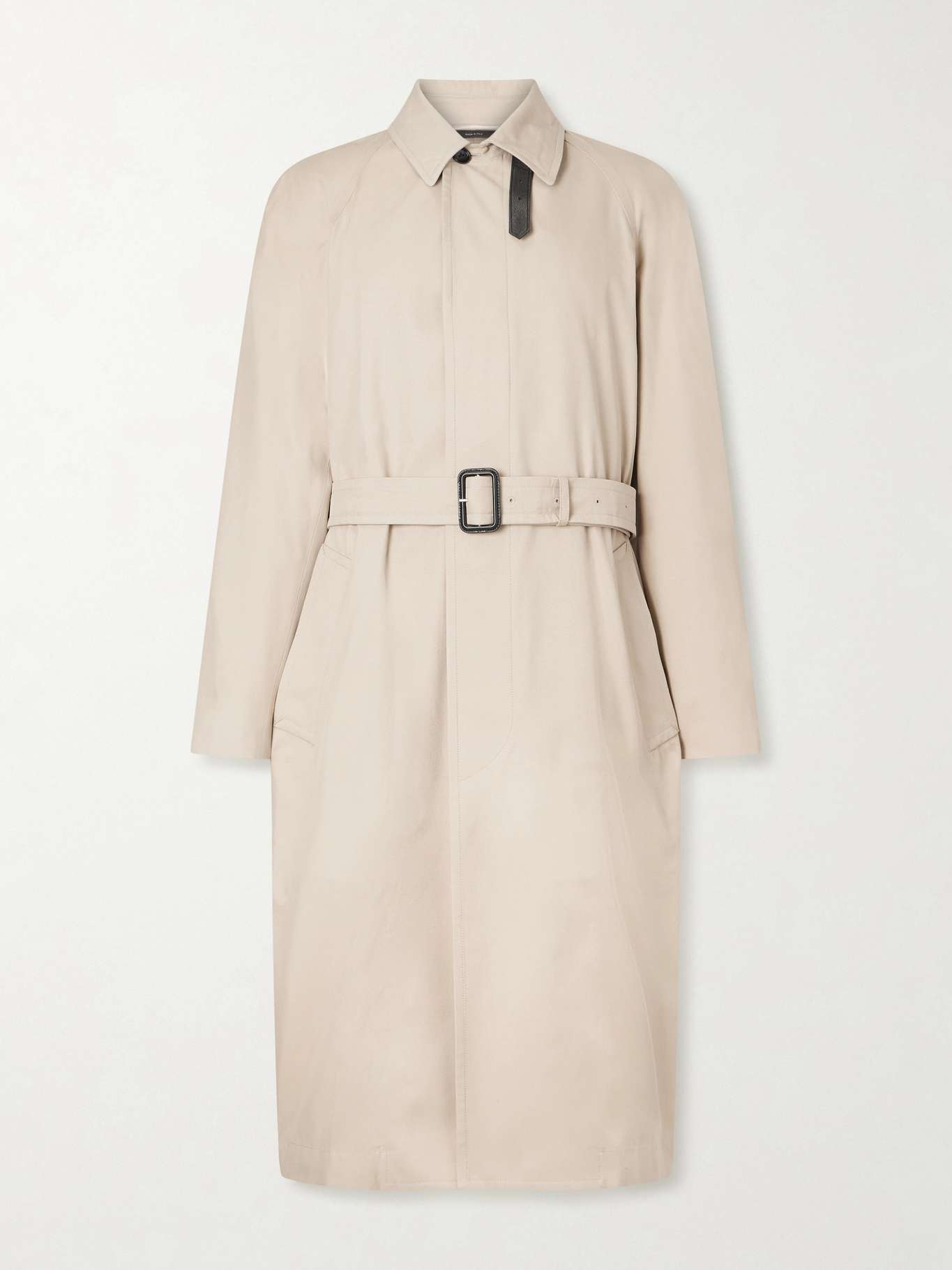 TOM FORD elevates the classic trench coat with subtle touches. For starters, the typical cotton-gabardine is blended with silk for a smoother handle. It's accented by black leather contrasts in the form of a throat latch and belt buckle.