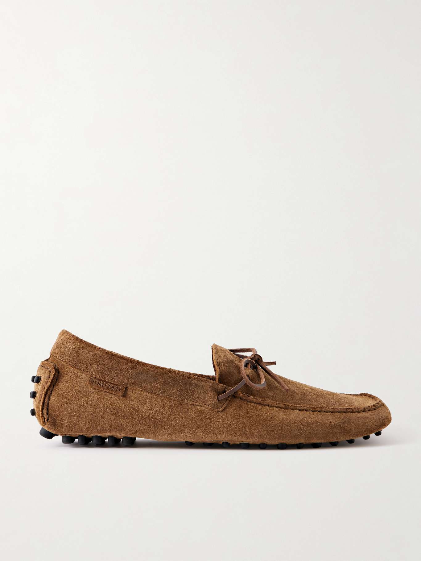 TOM FORD's 'Rod' loafers have pebbled soles, a feature borrowed from classic driving styles. They're made from suede with laces across the top and a branded label on one side.