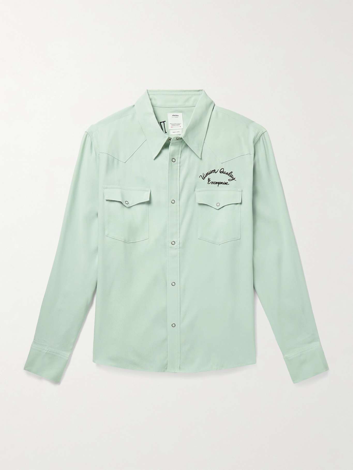 visvim's 'Four Corners' shirt is woven from lightweight canvas that's custom-finished with a 'pressed' treatment for smoothness. It's embroidered with various logos on the chest and back and has a Western-inspired pointed yoke.