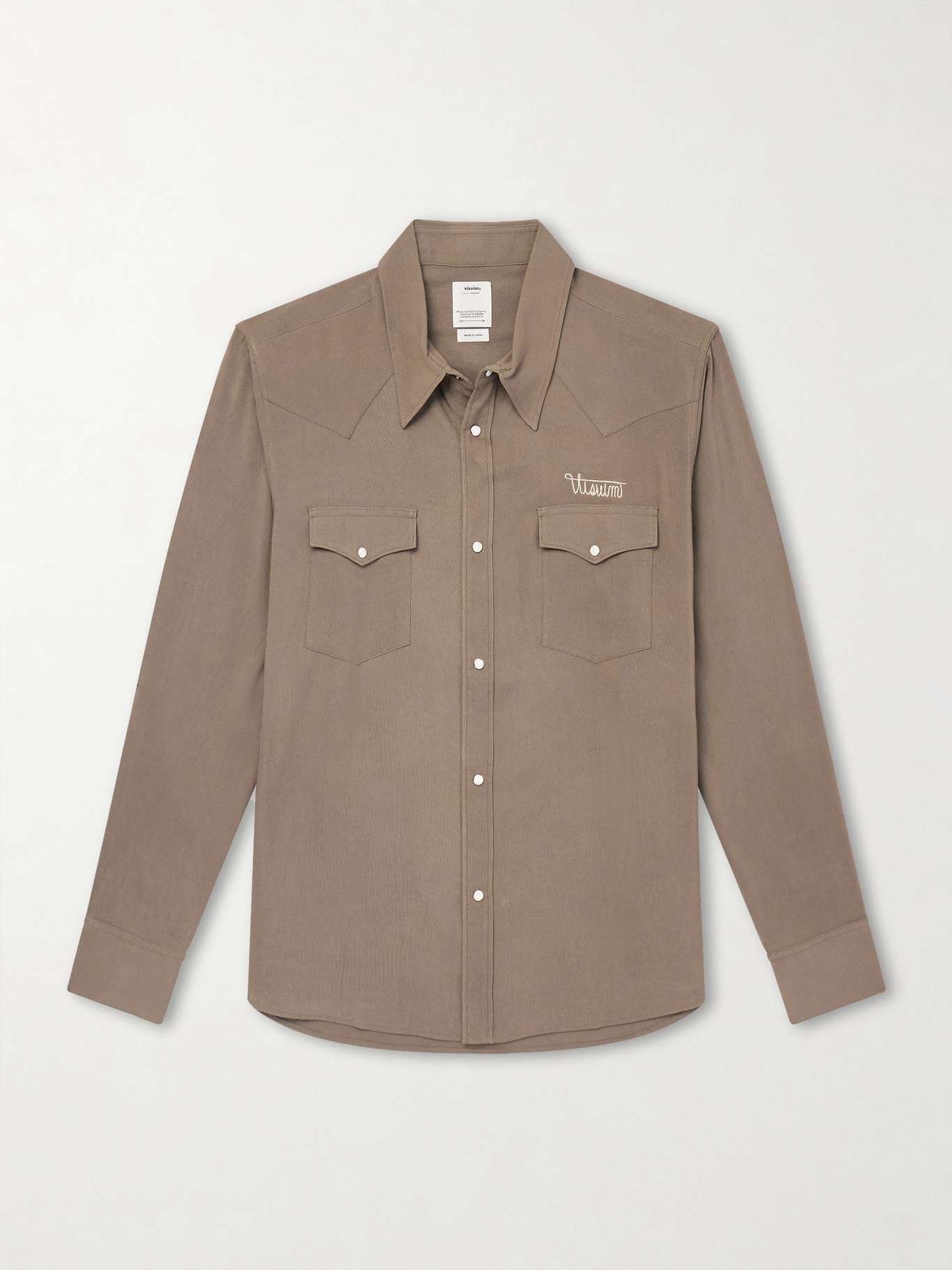 visvim's Western shirt has an angular yoke that perfectly marries with the pointed flap pockets. Cut from canvas, it's dotted with pearlescent snaps and embroidered with the brand's name on the chest.