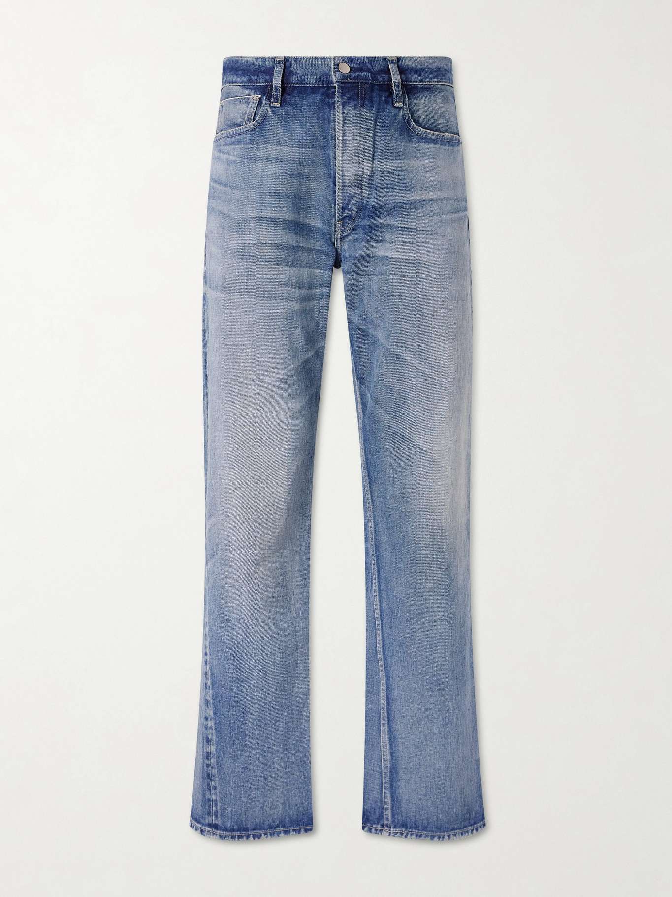 Fear of God's five-pocket jeans are cut in Japan from selvedge denim in a relaxed, straight fit and washed for a vintage feel. Antique-style metal hardware completes the finish. Pair these with a matching trucker jacket.