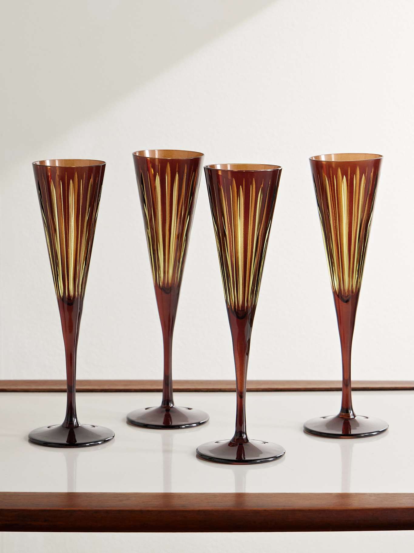 L'Objet's champagne flutes are patterned in a striped 'Amber' tint that catches the light beautifully. They make a great gift, particularly alongside the matching pieces in our edit.