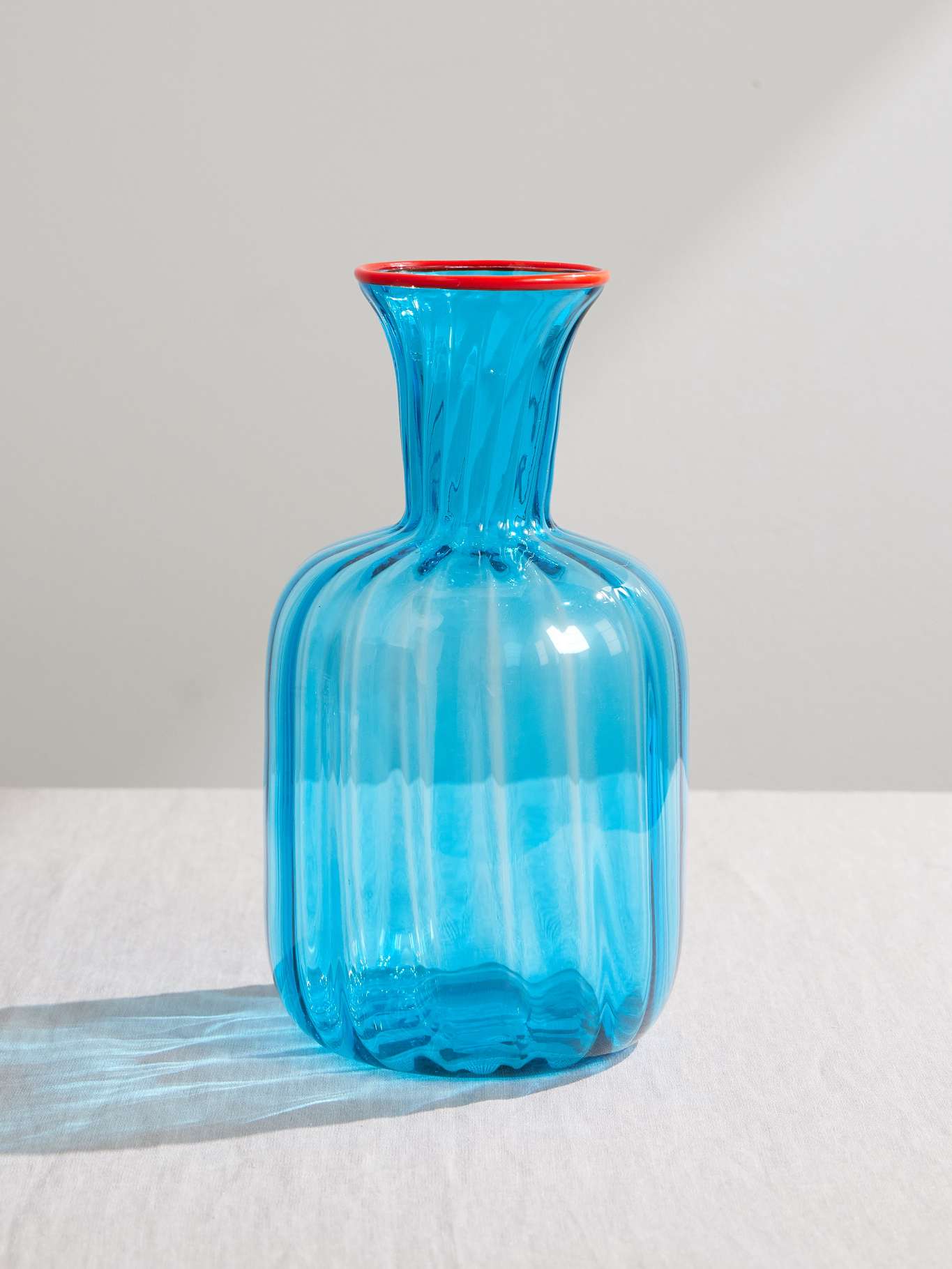 La DoubleJ's carafe is softly ridged, mirroring calming ripples through water. From the 'Aperitivo Family', it's been handblown in Venice from Murano glass and has a cool, contrasting rim.